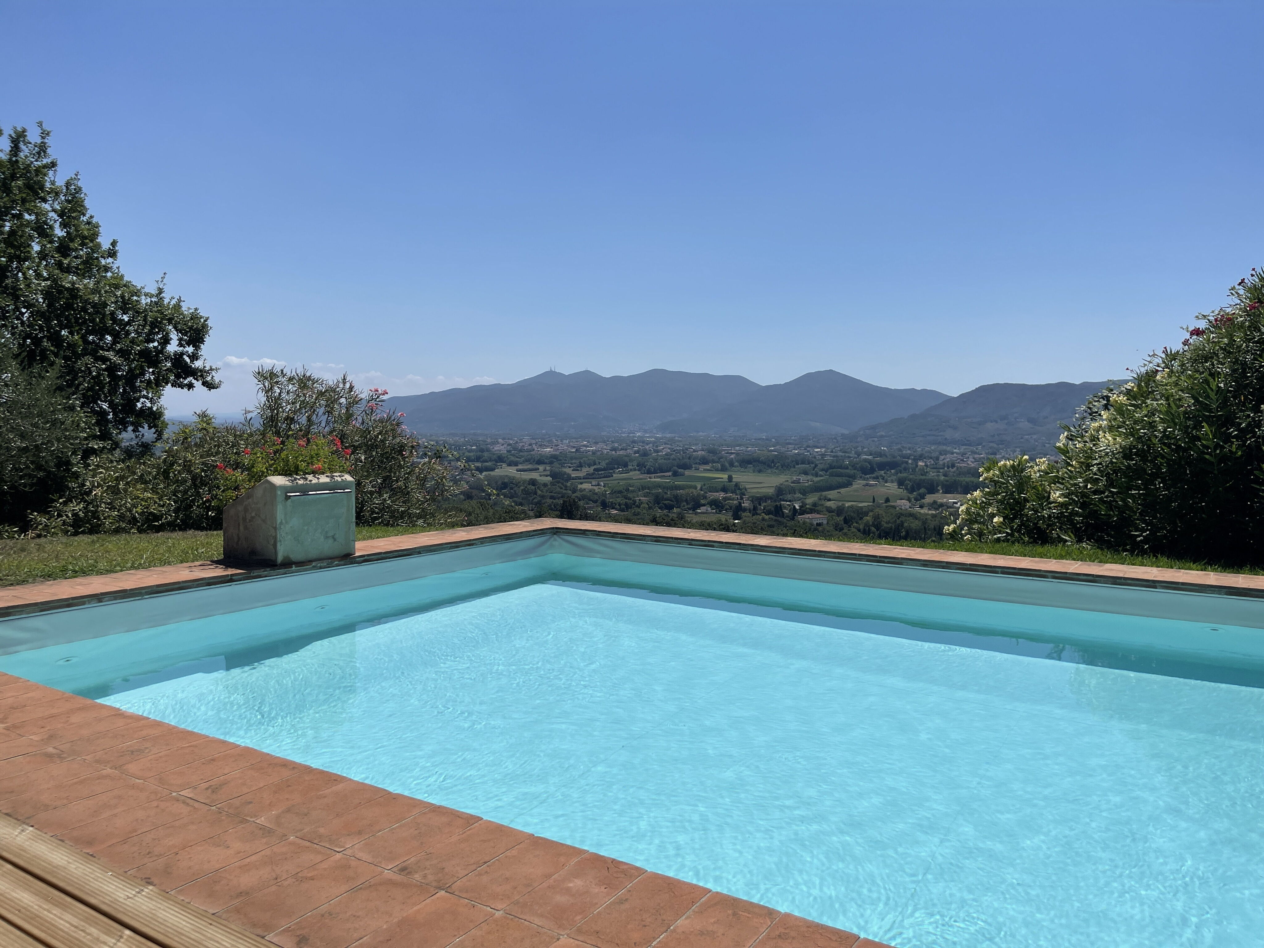 Il Vignale is situated on the hills of Lucca, in a large estate producing local red and white wine, honey and extra virgin olive oil, where we also rent another property called Le Pergole. The pool area in particular is set in a secluded and very panoramic position, where guests can entertain and relax enjoying the most spectacular views on Lucca and its towers , definitely one of the most beautiful views available on the plain of Lucca. The garden is fully fenced thus granting complete privacy. An appealing pergola creates the perfect shelter where to gather together for 'al fresco' meals or just relaxing admiring the views.