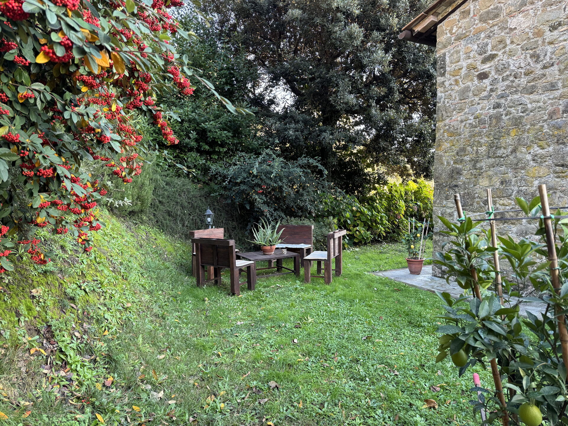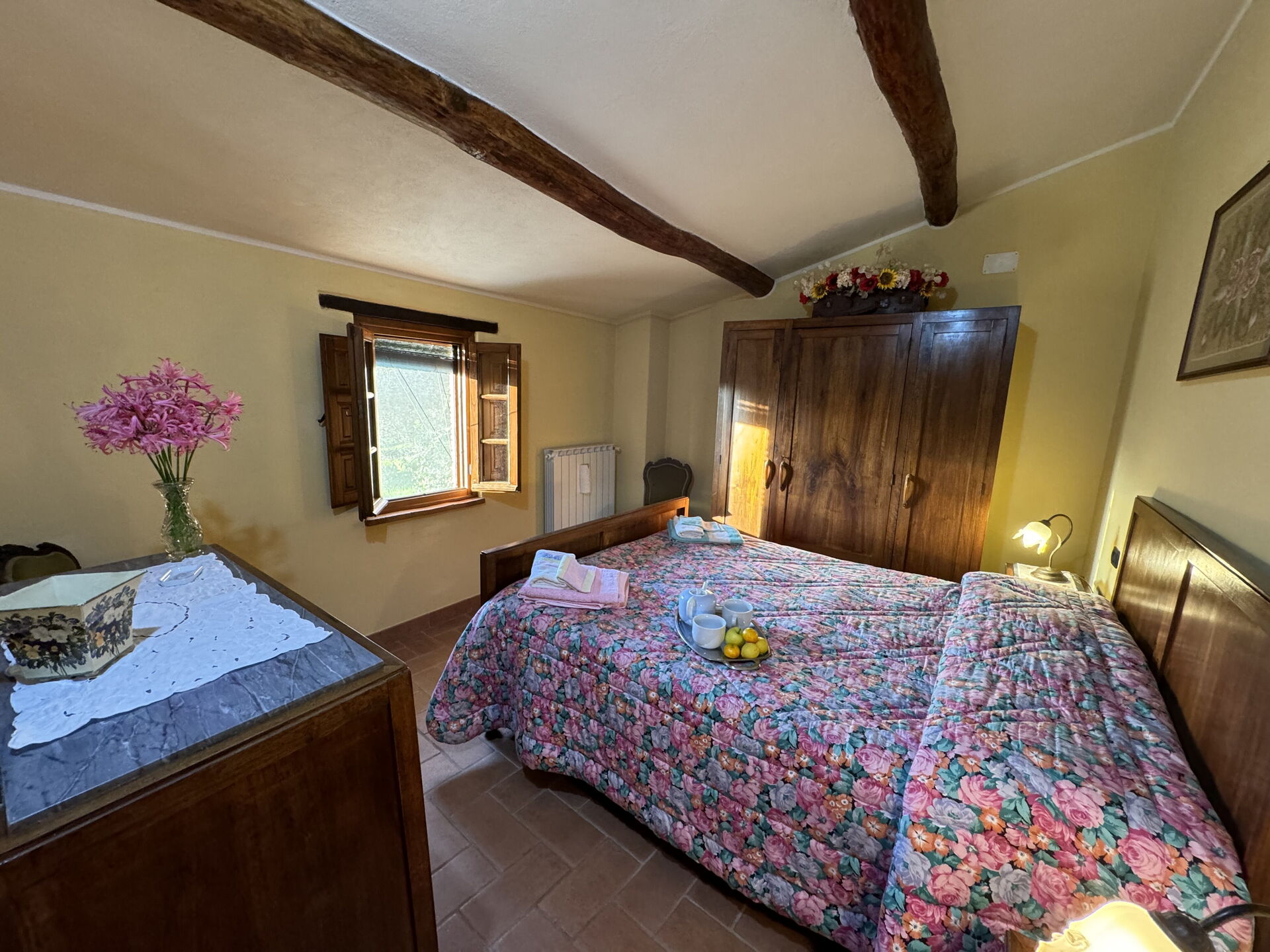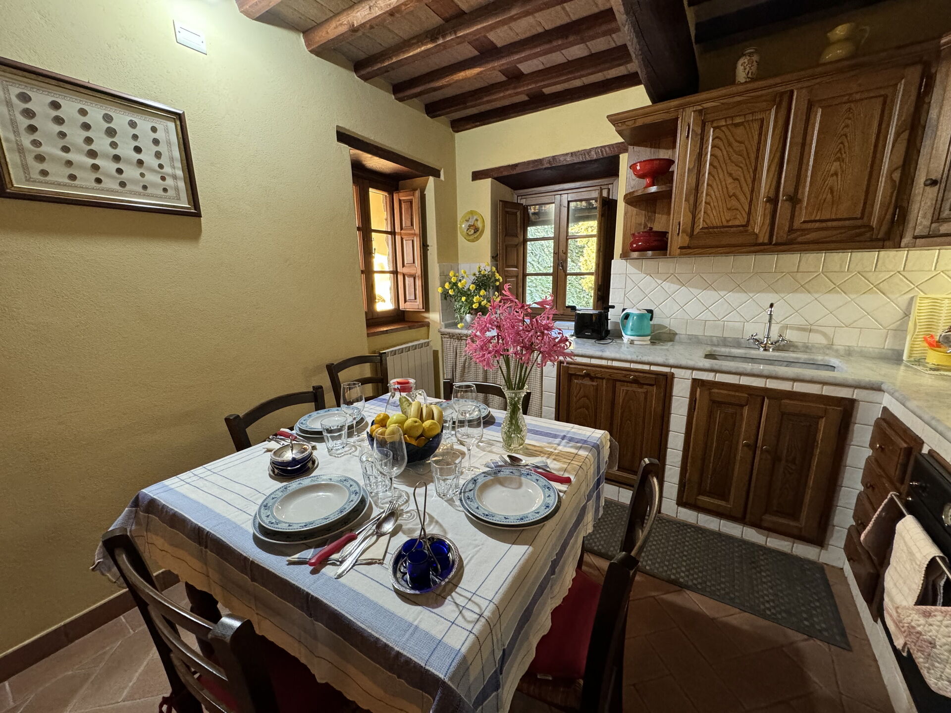 When you arrive at Batticapo di Ilaria you’ll find a beautiful clean well-maintained property with views of the hills ideal for a peaceful vacation in Tuscany. Regardless of how you spend your days - visiting museums, sightseeing, shopping or just driving in the countryside, when you arrive home you can unwind with your family and friends at the pool for a perfect ending to another day in Tuscany. Sharing a meal with friends and family is a big part of the Tuscan culture. Take advantage of the kitchen to prepare meals using local produce while on your holiday. The kitchen includes coffee machine, stove and refrigerator, as well as, plenty of tableware and cutlery for up to six people. Dine 'al fresco' like a real Tuscan, the fully furnished garden is the perfect setting to enjoy food, family and the lovely Tuscan weather.