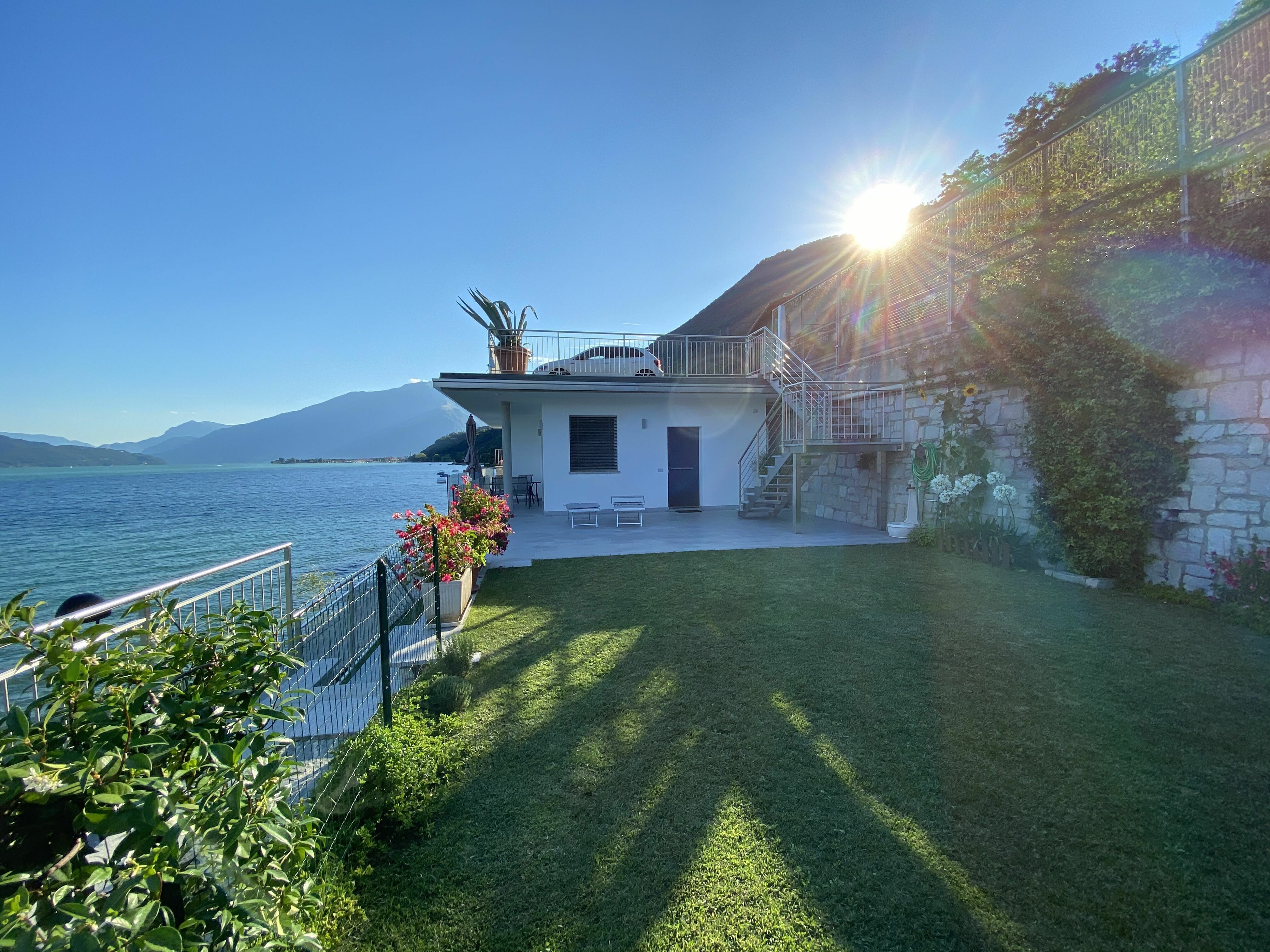 The outdoor spaces at "Gelsomino" are thoughtfully designed to complement the natural surroundings of the Lake Como area. The private fenced grounds of 210 square metres feature a lush lawn where you can relax and enjoy the fresh air in complete privacy. The property's exceptional proximity to the water, just 5 metres from the lake, means that the shoreline is essentially at your doorstep, allowing for effortless access to the pebble beach directly in front of the property. The outdoor setting is further enhanced by the immediate proximity to a dedicated cycle lane, located just 5 metres away, making it easy to explore the scenic lakeside paths at your leisure. A stepped path of 18 steps leads up to the house, adding a charming and characteristic touch to the approach of the property.
