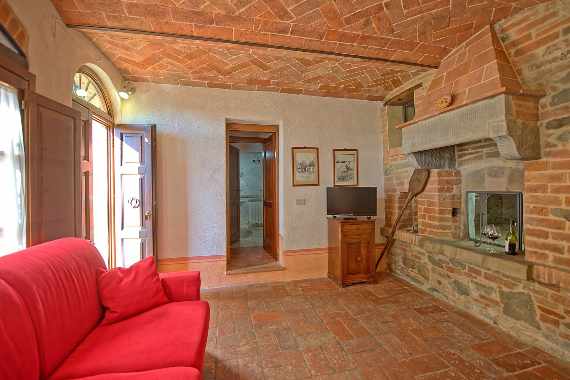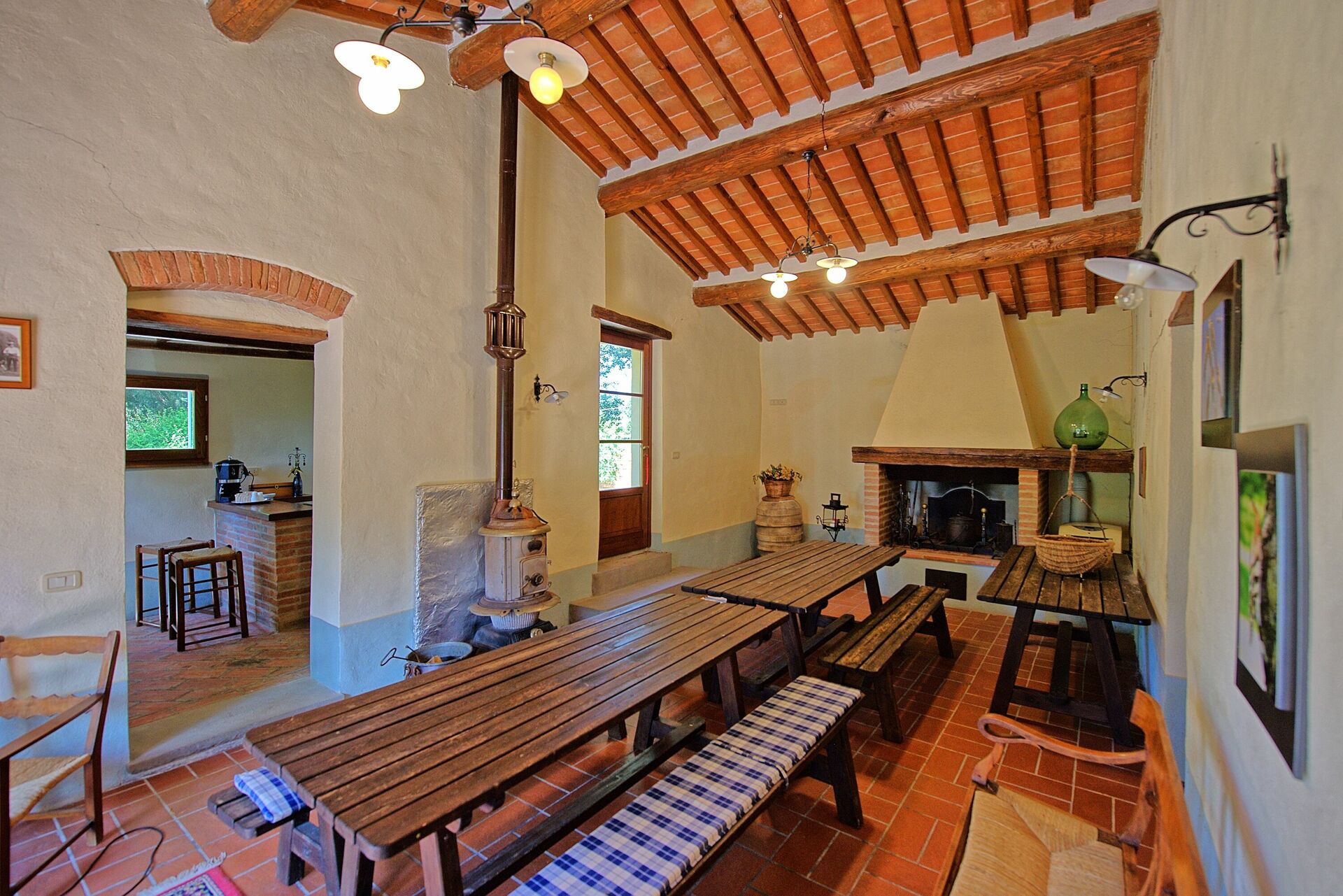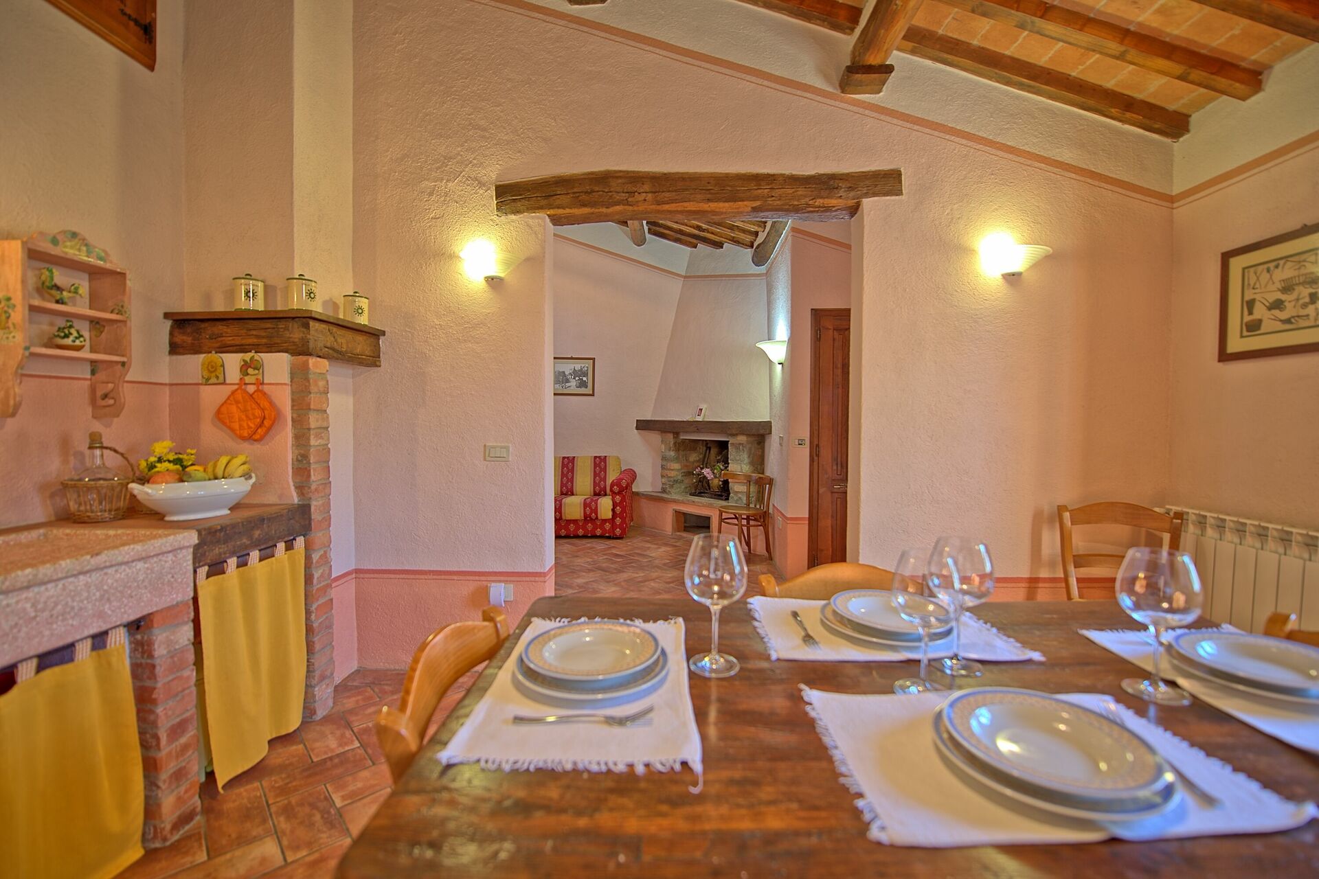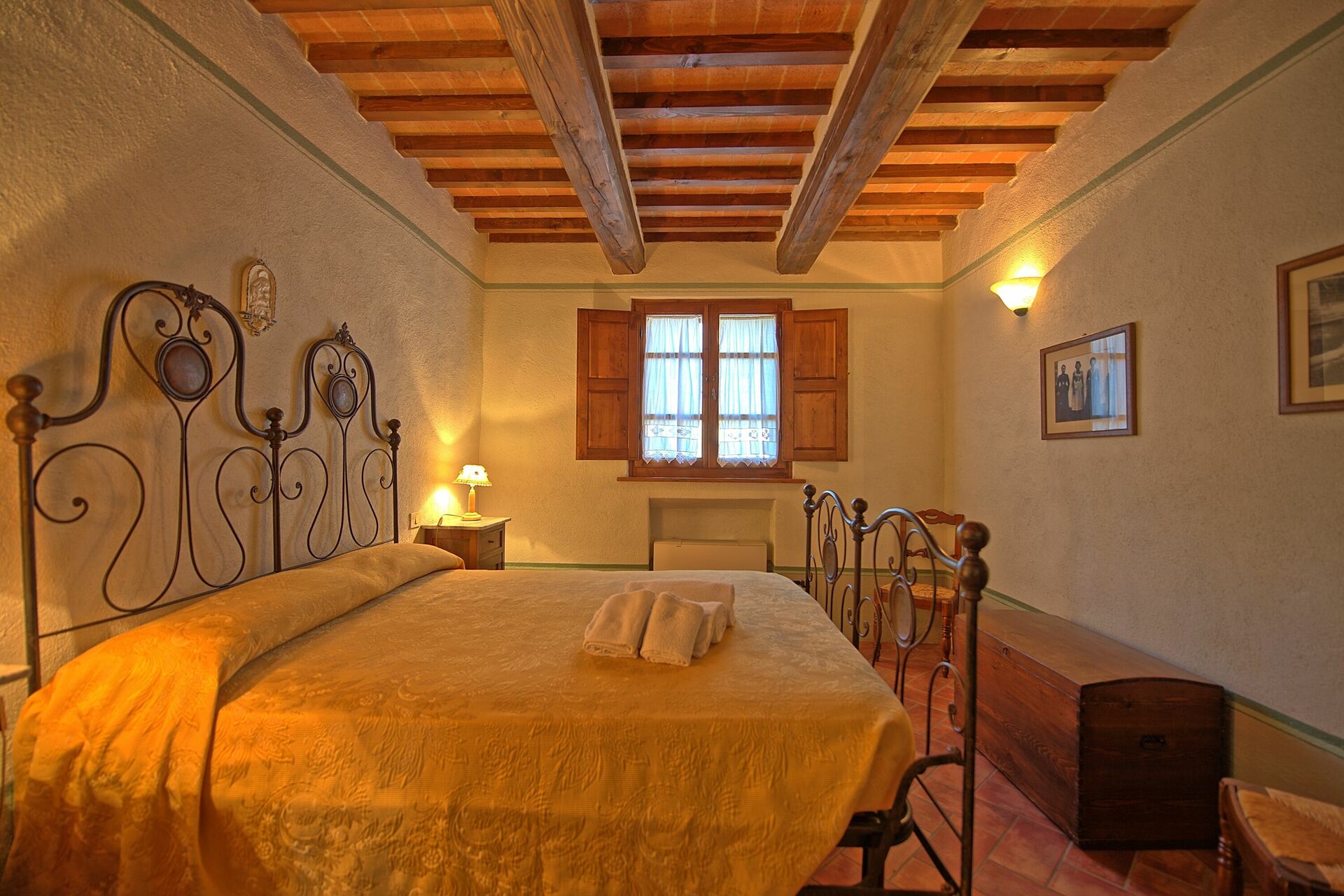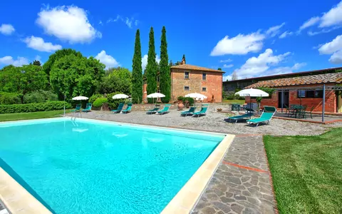 A spacious garden hugged by cypresses and other densely green trees, views of rolling hills and lush Tuscan landscapes all around, a private pool, a terracotta roof, a pretty and traditional Tuscan kitchen, charming bedrooms finished with detail and care, high exposed-beam ceilings, a nice little covered area for dining al fresco, lots of rooms with direct exits out onto the terrace... all of this and more is what you can expect from the gorgeous and wonderfully and typically Tuscan Villa La Fragola (meaning Strawberry Villa) just 500m outside the village of Chianacce, 19km (12 miles) from Montepulciano. Positioned in an especially scenic and peaceful part of the world that is ideal for those looking to get away from it all and relax on their vacation, this gem allows you to get a real taste of the charming and slow-paced life of rural Tuscany while also being ideally located just 5km from the highway and allowing easy access to many of the region’s most famous destinations and attractions. Those who choose Villa La Fragola, therefore, will get the best of both worlds – the restful escape into the dreamy Tuscan countryside and plenty of opportunities to play the serious tourist and tick some key sights off of your bucket list. In addition to Montepulciano being just 19km (12 miles) away, other nearby cities include Cortona 20km (12 miles) away, Arezzo 45km (28 miles) away, Montalcino 52km (32 miles) away, and Perugia 62km (39 miles) away.