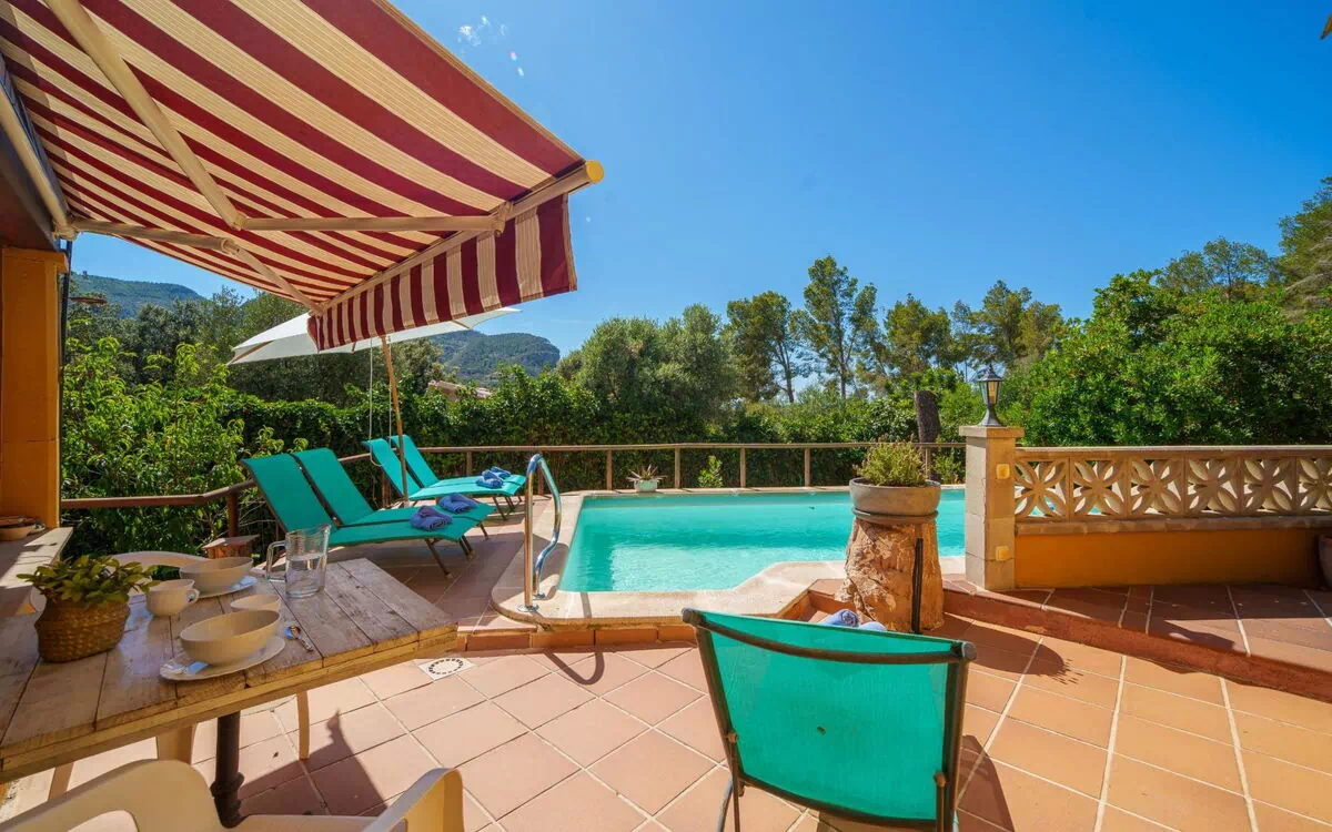 The Es Port des Canonge is a large, rustic villa situated in a quiet, traffic-calmed area, surrounded by trees and fields in Banyalbufar, Spain. The property boasts a terraced garden with trees, lawn for sunbathing, and an angular swimming pool. It is equipped with amenities such as Internet WiFi, parking, and a central heating system. The villa offers a peaceful retreat for your vacation rental, just 250 meters from the beach.