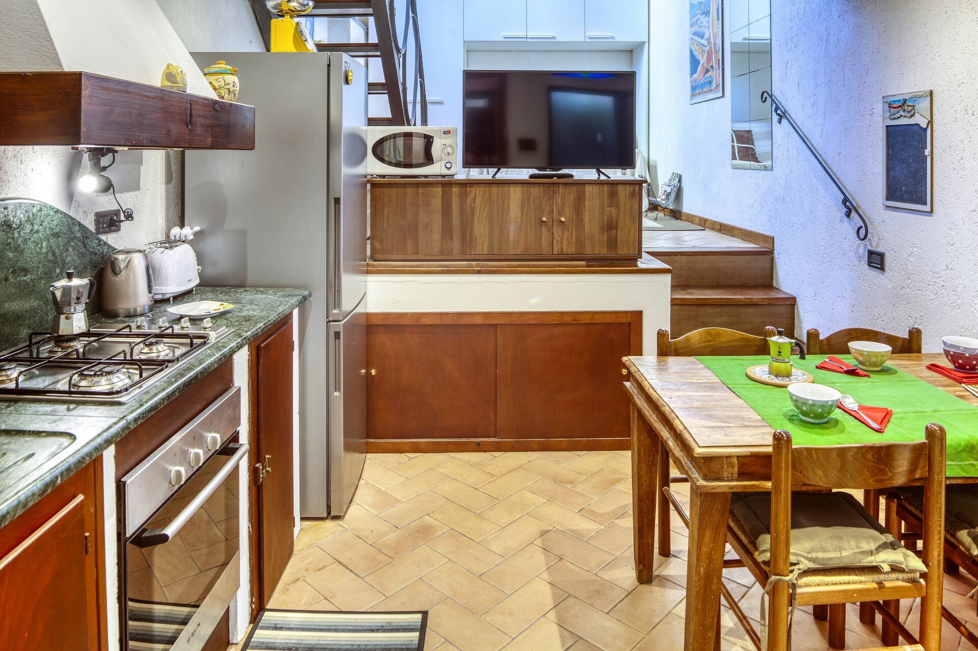 Equipped kitchen, dining table, oven, microwave oven, toaster, Moka coffee maker, kettle.