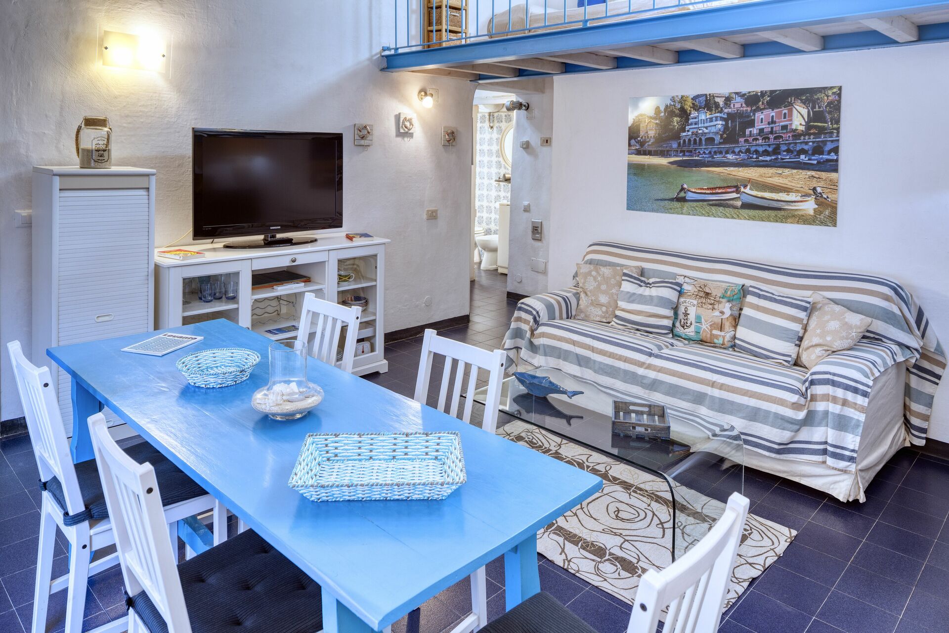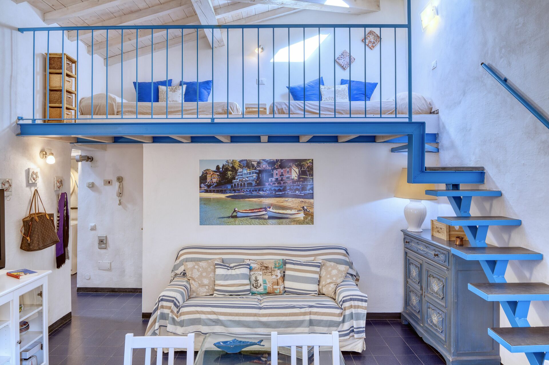 The apartment is composed of: a double bedroom, a living room with sofa, dining table, two single beds on the mezzanine above the living room. Equipped kitchen, bathroom with shower. Free Wi-Fi.