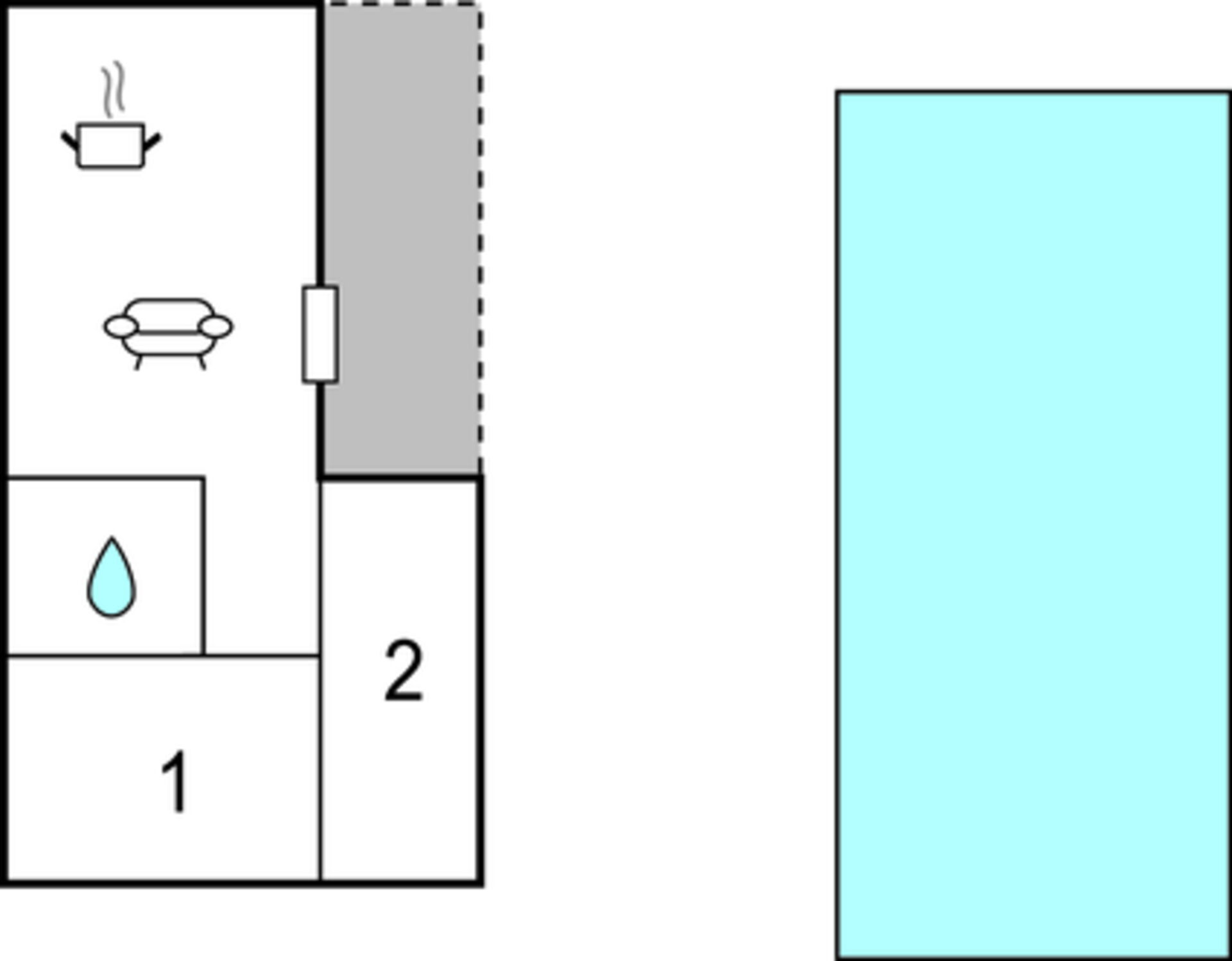 Kitchen + living room: well equipped kitchen, dining table, dishwasher, fridge, microwave, stove top, oven, washing machine, WIFI internet, air conditioning.