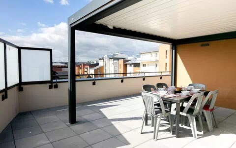 The apartment boasts a large, open kitchen that is well-equipped with an oven, dishwasher, 2 induction hot plates, 2 gas rings, toaster, kettle, microwave, freezer, and an electric coffee machine. There are 2 additional showers/WC. Electric heating is available throughout the unit. The apartment features 2 large terraces spanning 100 square meters, complete with terrace furniture and a covered balcony. Other amenities include a washing machine, dryer, iron, and internet (WiFi, free). A reserved parking space (n 27, roofed) is provided.