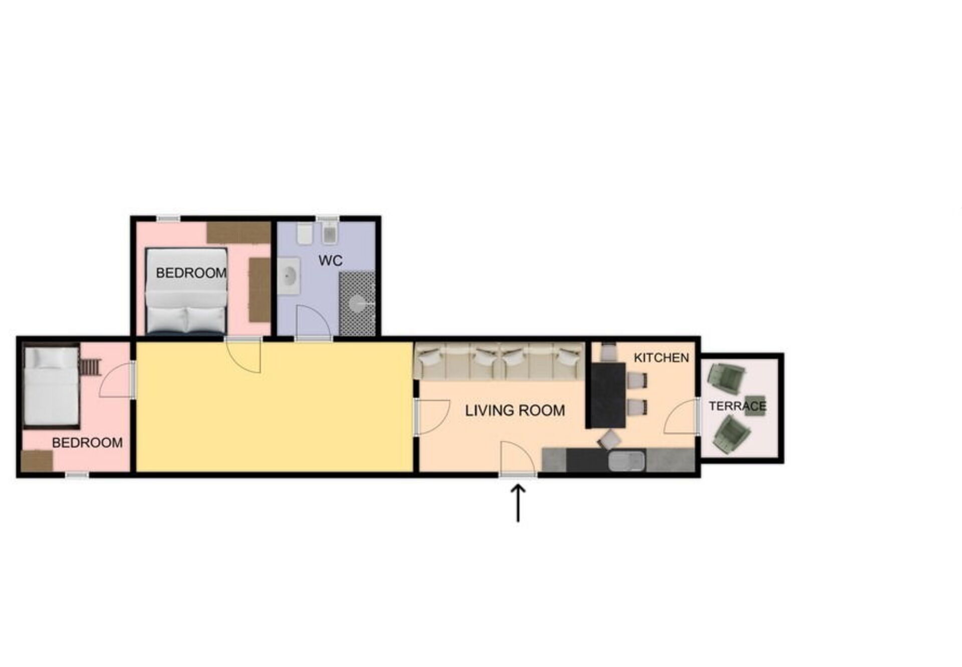 Including: kitchen + living room, 2 bedrooms, bathroom.