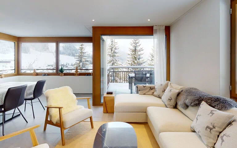 The 3 1/2 room apartment can accommodate up to 5 people. The apartment on the 3rd floor has a living room with dining area and open kitchen. Enjoy the fresh mountain air on the balcony. One bedroom has a double bed (180x200 cm) and the second bedroom has two single beds (90x200 cm). 2 wet rooms with bath/toilet, shower/toilet and a washer-dryer are available. In the modern kitchen you will find a dishwasher, oven, microwave, Nespresso machine, raclette and fondue dishes. The living room also has a sofa bed (140x200 cm) and a fireplace for cozy evenings.