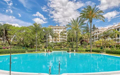 This formal vacation rental, the Apartment block "Hacienda Nagueles", built in 2001, offers a prime location just 1 km from the center of Marbella, Spain. Situated in a quiet, sunny position and only 250 m from the sea, this property boasts a shared garden with a lawn, a seasonal swimming pool (available from June 15 to September 15), a children's pool, and an outdoor shower. Additionally, it features on-site amenities such as a reception, lift, and communal covered parking.