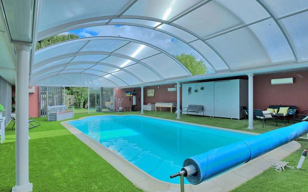 Immerse yourself in the shared facilities, including an angular heated swimming pool (10 x 4 m, depth 130 - 200 cm) with a privacy cover, available seasonally from June 15 to September 14, open from 9:30 AM to 8:00 PM. The pool area features a shower/WC, and the pool is maintained by the owner/gardener, ensuring a pleasant and well-kept environment.