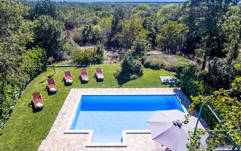This single-family house "Vila Milančić" offers a tranquil and sunny elevated position in Gornji Proložac, Croatia, just 6 km from Imotski. The two-story vacation rental boasts a private 700 m2 fenced property with a 200 m2 lawn, an angular swimming pool (8 x 4 m, depth 140 cm, available seasonally from May 1 to October 1) with an internal staircase, a WC in the pool area, an outdoor shower, a 70 m2 terrace, garden furniture, a barbecue house, and pool maintenance by the owner/gardener. Inside the house, you'll enjoy amenities like internet access, a fitness room, a playroom, and a washing machine. Parking is available on the premises for up to 3 cars.