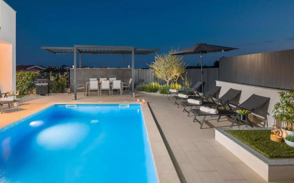 Villa "Freya" is a two-story vacation rental in Medulin, Croatia, offering a private, fenced property spanning 570 square meters with a lawn, angular swimming pool (7 x 4 m, 28 square meters, depth 140 cm, available seasonally from May 1 to October 1), Internet Wi-Fi, and parking for three cars. The villa is equipped with amenities such as an outdoor shower, terrace, garden furniture, barbecue, billiard table, playroom, table football, and a washing machine.