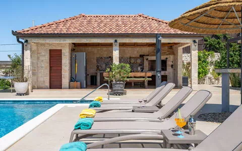 Villa Tanja is a beautiful single-family house located 17 km from the center of Sukošan and 22 km from Zadar, Croatia. This vacation rental offers a private 1'500 m2 fenced property with a seasonal swimming pool (8 x 4 m, depth 140 cm, available from May 1 to October 1), an outdoor shower, internet access, a washing machine, and parking for two cars on the premises.
