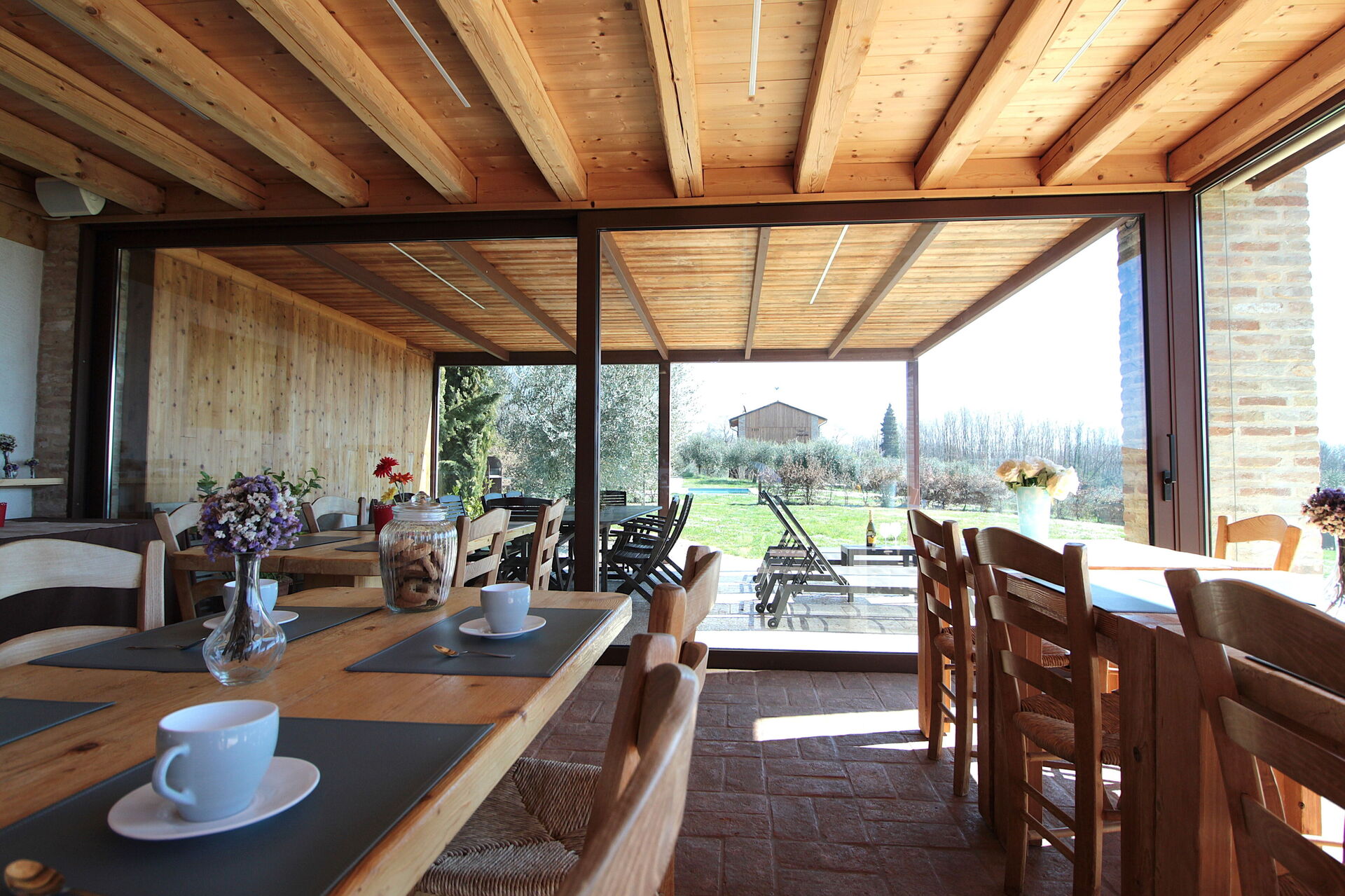 Dining room: three dining tables, armchair, air conditioning, WIFI internet, exit to the garden.