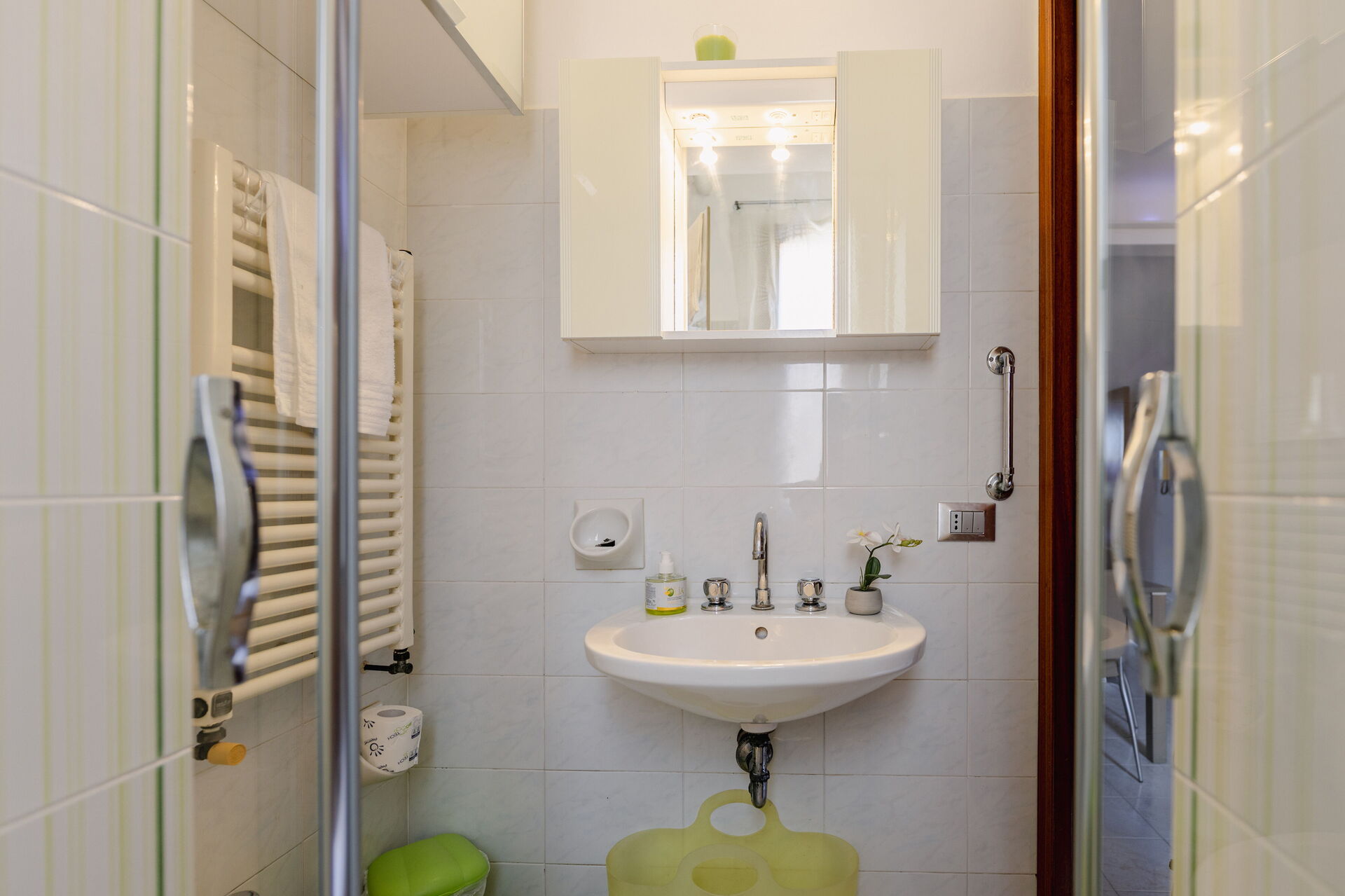 Bathroom: basin, toilet, shower, hairdryer, washing machine.