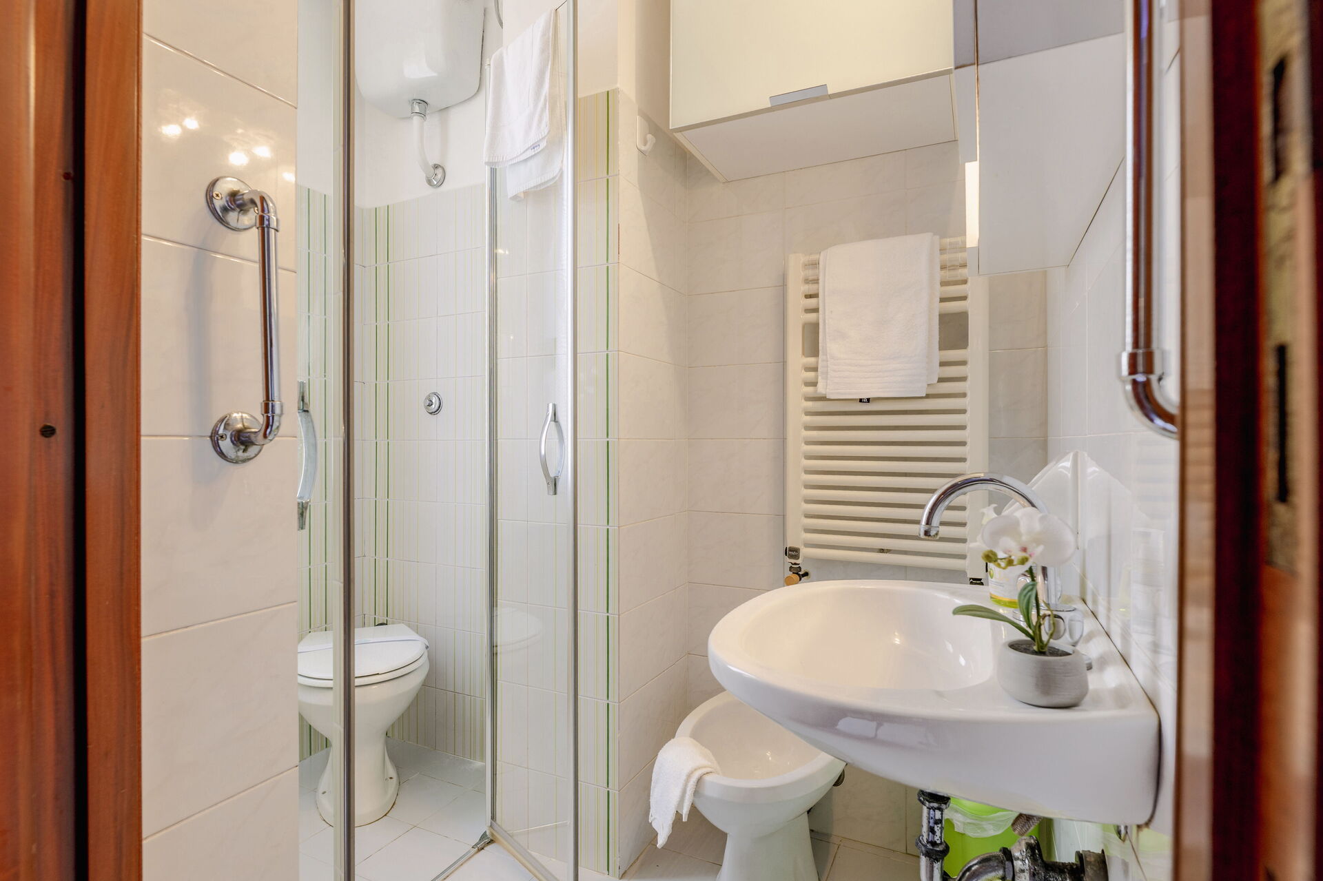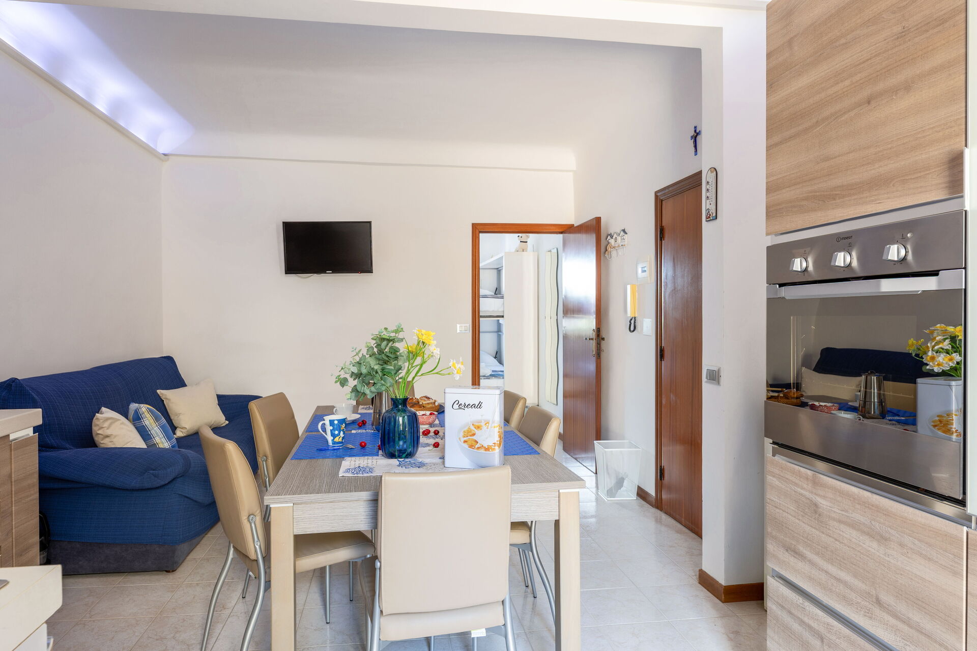 Kitchen + living room: well equipped kitchen, dining table, fridge, freezer, stove top, oven, toaster, italian coffee machine, sofa, working desk, WIFI internet, air conditioning, satellite tv, smoke detector, exit to the balcony.