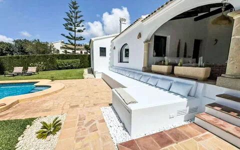 Situated in Teulada, Spain, the very luxurious and renovated "Alborada" villa offers a serene escape surrounded by trees. You can enjoy a private, well-maintained terraced garden spanning 2,700 square meters with a lush lawn, natural garden, meadow, and orchard. The property boasts a seasonal angular swimming pool (10 x 5 meters, depth 40 - 210 cm) with an internal staircase, perfect for refreshing dips. Outdoor amenities include a shower, patio, pergola, garden furniture, barbecue, and parking, ensuring a comfortable vacation rental experience.