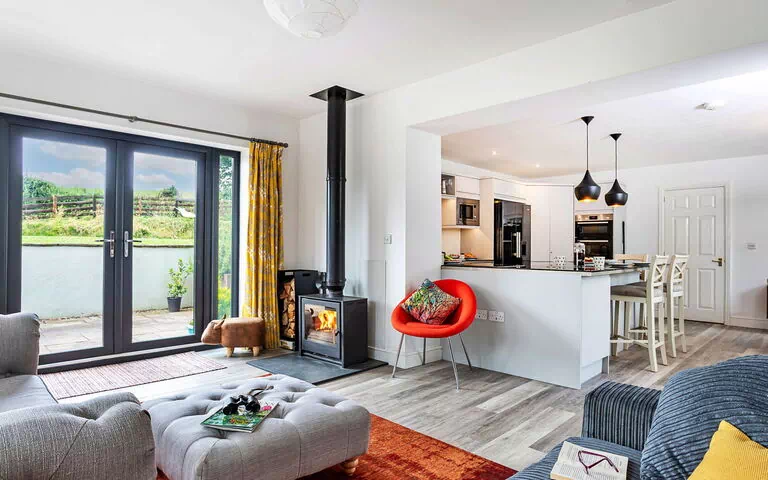 The property is called "Quarry Lodge" and is designed for a vacation stay. It offers a spacious living area, multiple bedrooms, and a well-equipped kitchen, making it suitable for families or groups of up to 6 adults. The inclusion of amenities such as a fireplace, dishwasher, and washing machine adds to the convenience and comfort of your stay.