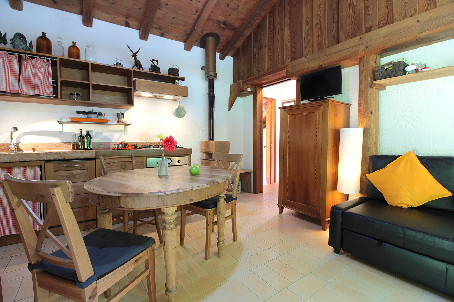 Kitchen + living room: well equipped kitchen, dining table, dishwasher, fridge, stove top, oven, italian coffee machine, sofa bed double, WIFI internet, television.