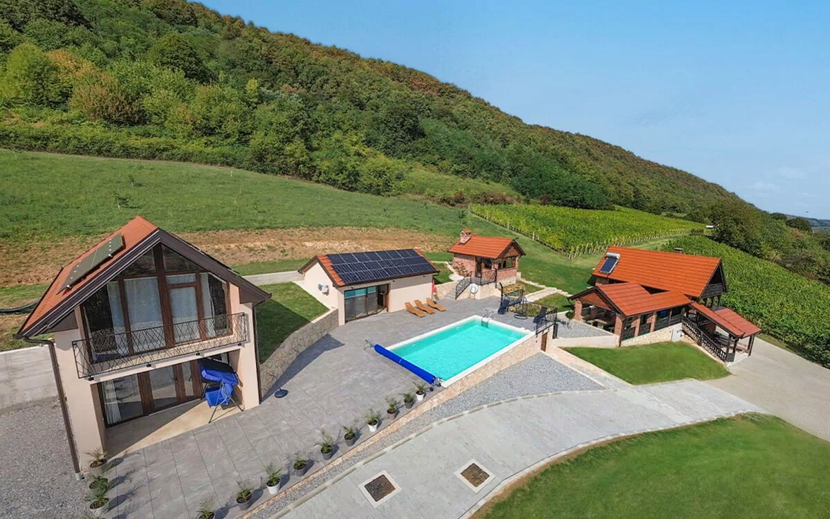 Vila Breg is a cosy, rustic single-family house spanning three storeys, located in Kalnik, just 16 km from Križevci, Croatia. This holiday rental is positioned 42 km from the centre of Varaždin and 69 km from the centre of Zagreb, nestled on a slope within a private 5,000 m2 property that includes 1,000 m2 of lawn and trees. The property features an angular heated swimming pool measuring 8 x 4 m with a depth of 145 cm, available seasonally from 15 April to 14 October, complete with salt water, an internal staircase, and a salt-electrolysis pool-cleaning system. A shower and WC are conveniently located in the pool area, alongside an outdoor shower and hot tub. The spacious yard offers a 20 m2 terrace with garden furniture, a barbecue house, and a children's playground equipped with a slide and swing. Internet access and WiFi are available throughout the complex, ensuring you remain connected during your stay. Parking for up to four cars is provided at the house on the premises, with steep motor access via a 100 m unmade road. The unit comprises two houses rented together as one unit.
