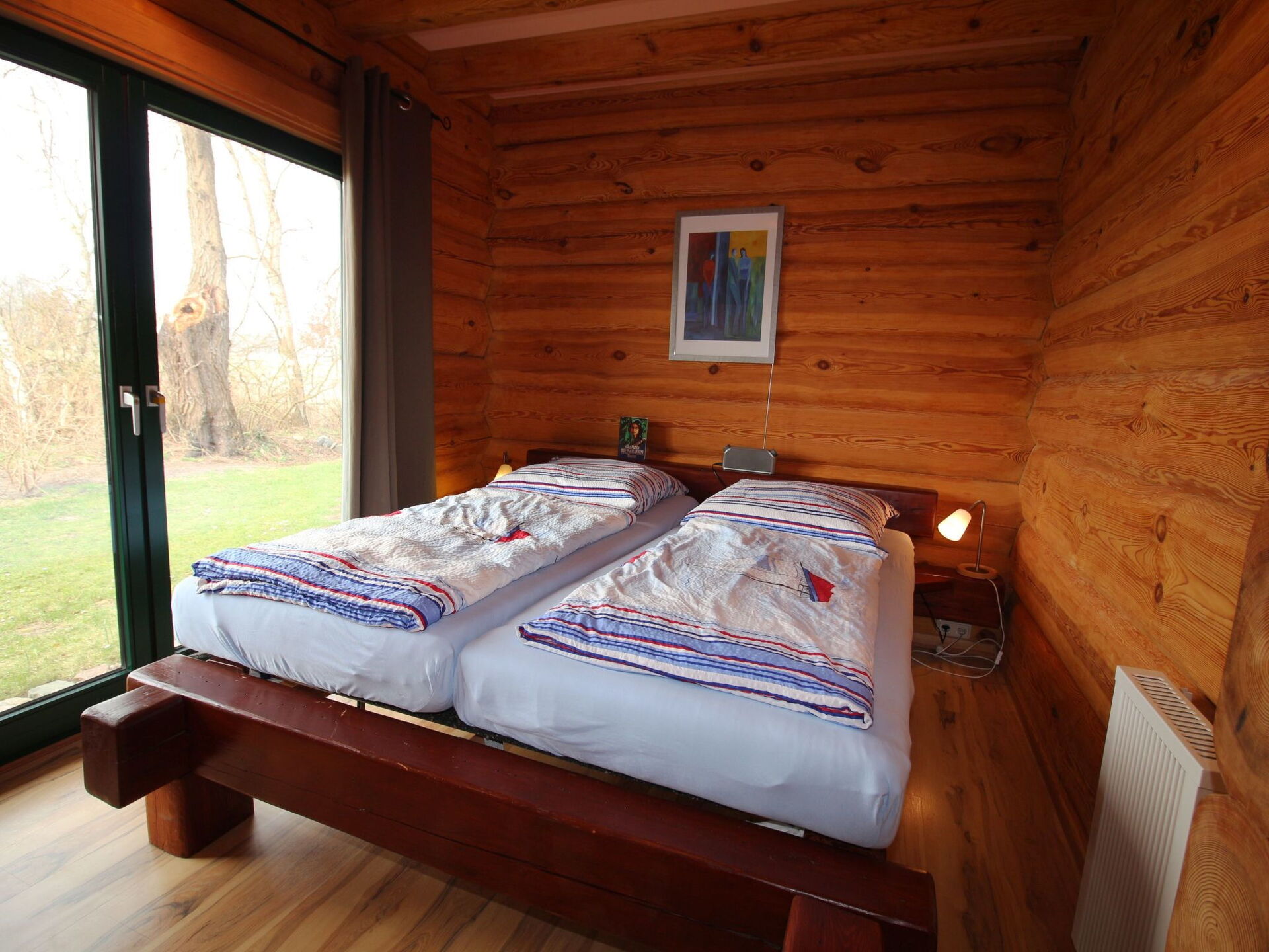 Our cosy log cabin "Haus Kranichblick" is located in a holiday home settlement surrounded by greenery and Pomeranian forest landscape on the edge of the village of Bodstedt and the nature reserve "Vorpommersche Boddenlandschaft". It therefore guarantees a relaxing and peaceful holiday. A mild coastal climate, kilometres of fine sandy beaches and rustic forests create an idyllic location. Time out in the countryside - an ideal holiday resort at any time of year away from the hustle and bustle of the seaside resorts. spend your holiday in our lovingly designed "Haus Kranichblick". The property covers 520 m² and the living space in the house is approx. 100 m². t. On the ground floor there is an open, fully equipped kitchen (if something is missing, we will take care of it), the living room with a couch and a nice, cosy fireplace, a bathroom with a large shower and hairdryer as well as a bedroom with a double bed for 2 people and another bedroom with 2 single sinks and a washbasin. The ground floor is tiled and has underfloor heating. The sunny terrace is a wonderful place to relax and enjoy great barbecue evenings. There are garden chairs with adjustable backrests and cushions for sunbathing and a column air grill. The garden invites you to play, relax, linger and unwind, and on the upper floor there is a bedroom for 2 people and access to our large, beautiful balcony with views of the Bodden and an animal observation post. Of course, a high chair and travel cot are available for the little ones.