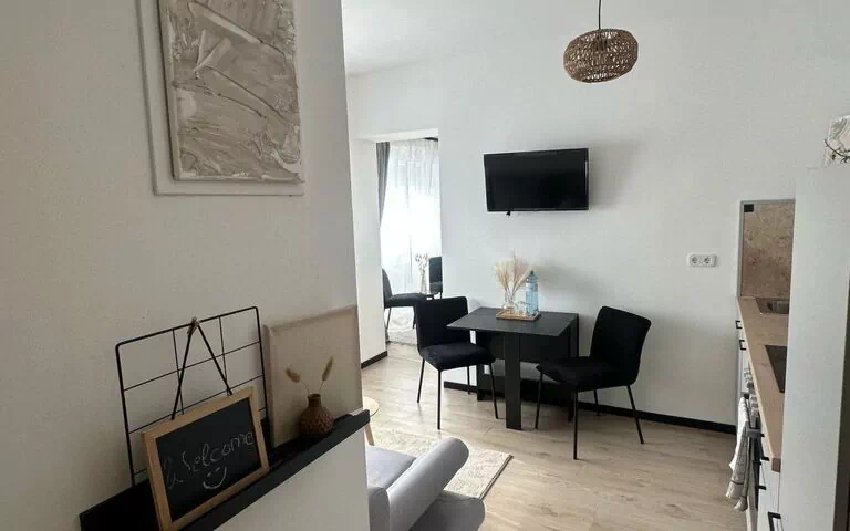 You will find this ground-floor accommodation offers a thoughtfully designed space of 40 m² within a multiple-family dwelling. The property functions as a granny flat located in a housing estate. The sleeping arrangements include a dedicated bedroom featuring a double bed with a width of 1.80 m, and this bedroom can be completely darkened to guarantee you a peaceful night's sleep. Additionally, the living area contains a double sofa bed for 2 people, and this space is also dimmable. The flat includes one bathroom equipped with a shower, basin, toilet, and hair dryer. The cooking and living area features a 3-plate stove, kitchen hood, oven, capsule coffee machine, fridge with freezing compartment, toaster, electric kettle, dishwasher, and dishtowels. You will have one dining table with seating for 4 people in the one living room, which is dimmable. The property underwent its last complete renovation in 2024.