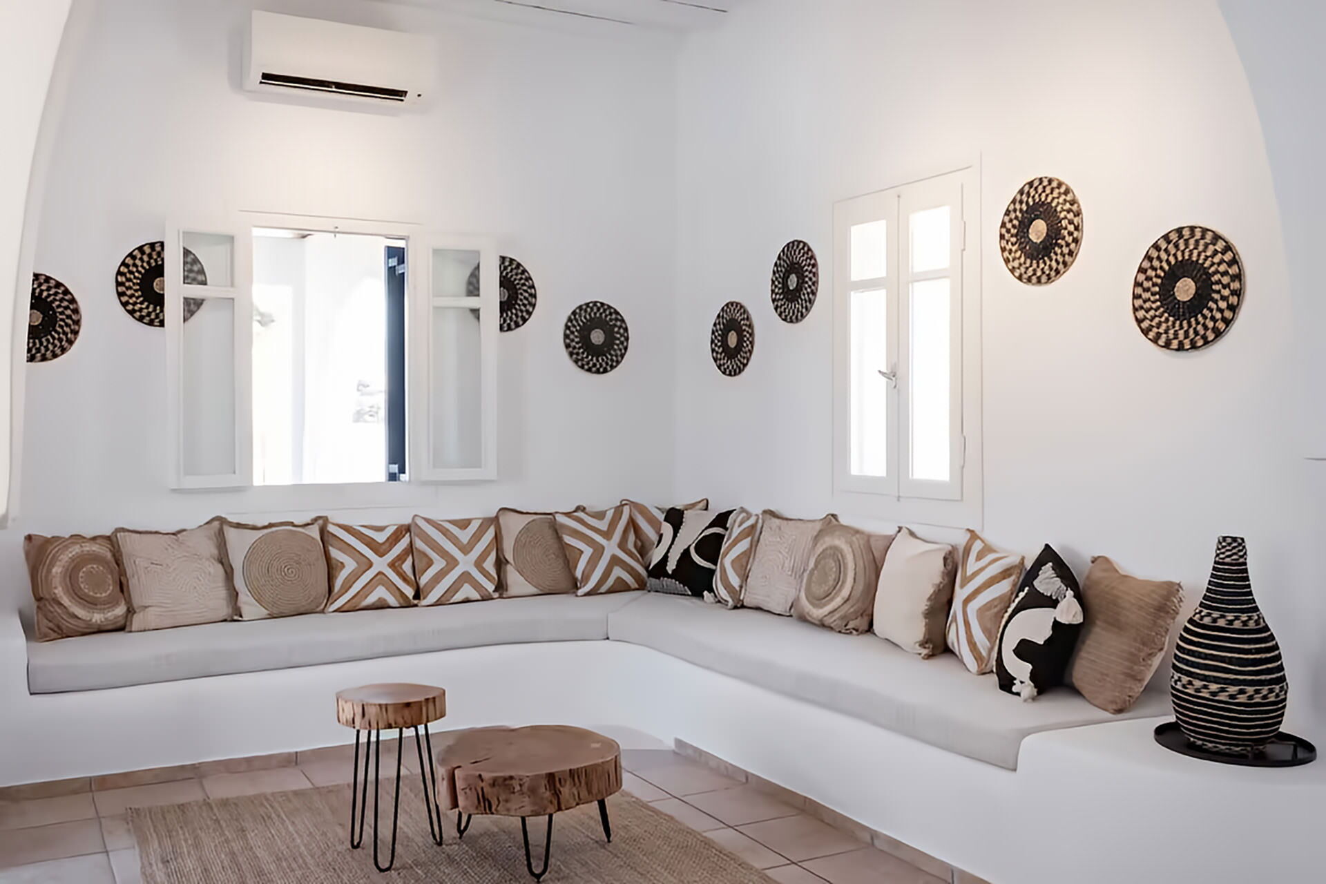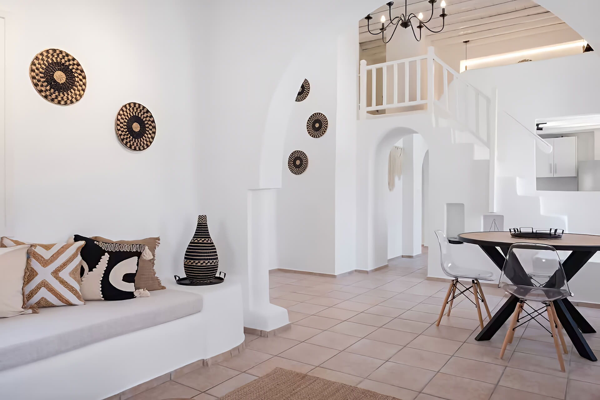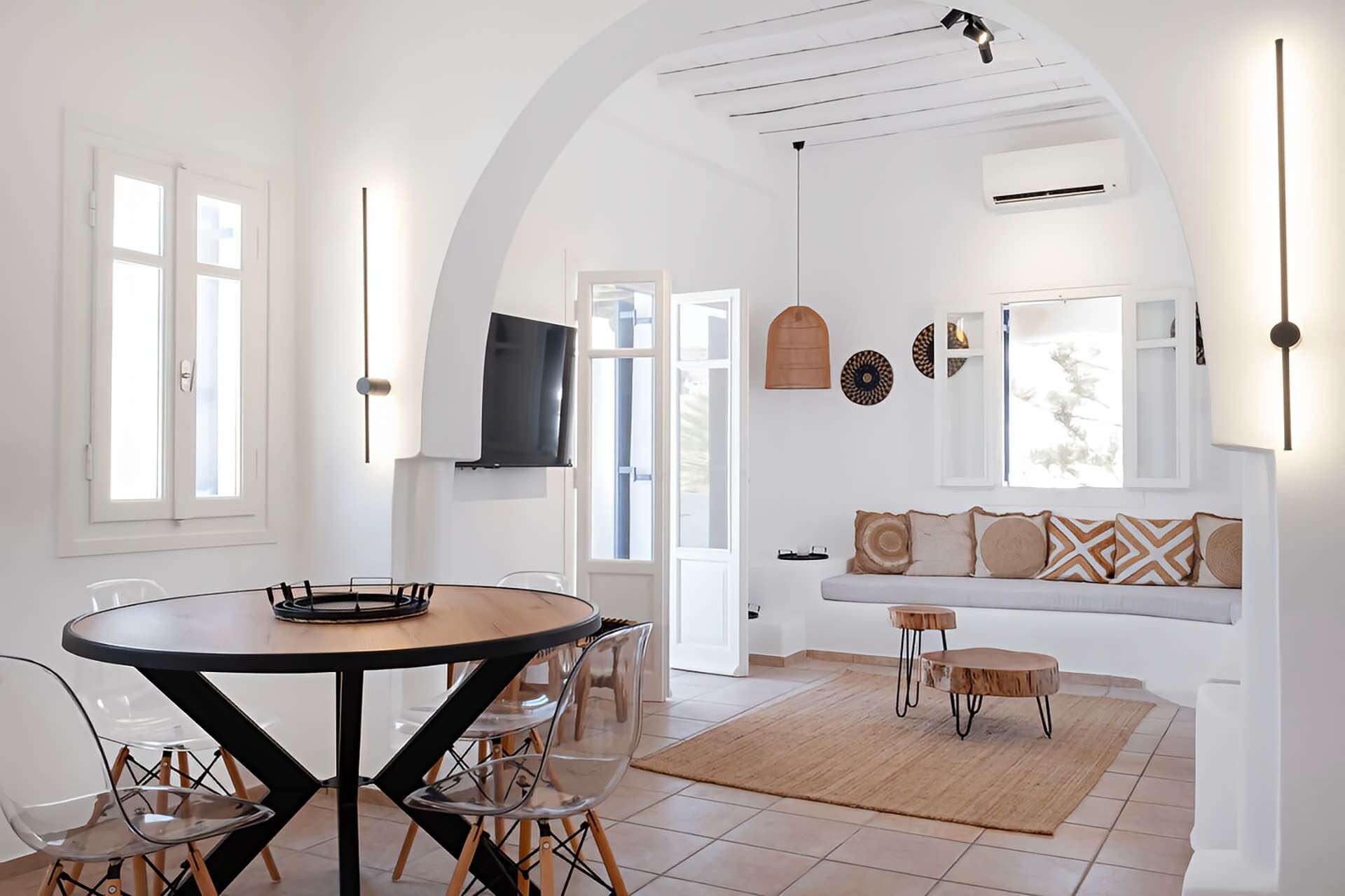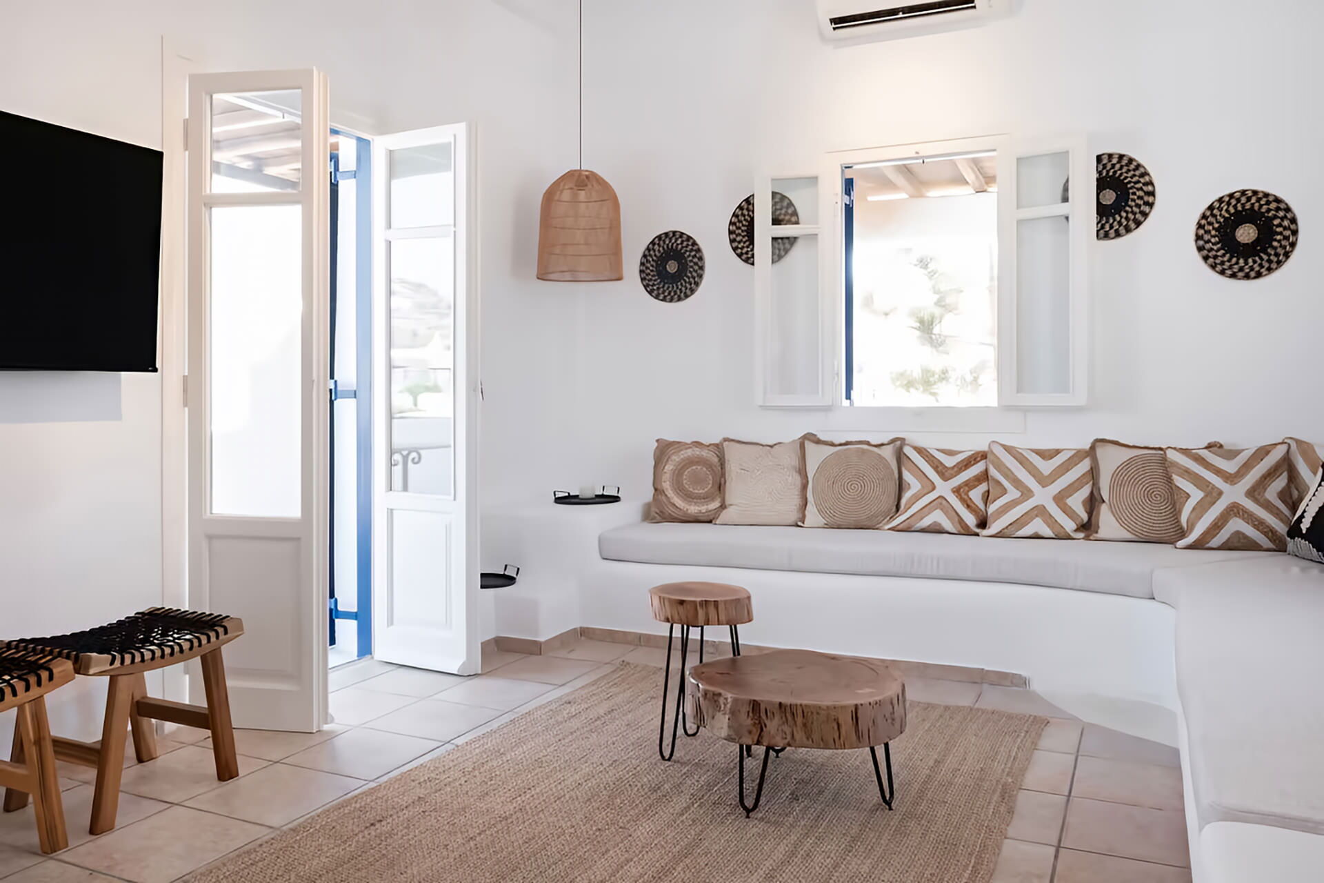 This spacious apartment in Mykonos accommodates up to 6 guests across 3 well-appointed bedrooms and 2 bathrooms, making it an ideal choice for families or groups seeking a comfortable holiday retreat. The apartment is set within a private residence and offers a thoughtfully designed interior layout that balances functionality with the relaxed elegance characteristic of Cycladic living. The 3 bedrooms are configured to ensure restful stays for all guests, while the 2 bathrooms provide ample convenience for the full capacity of 6 occupants. The living spaces flow naturally toward the outdoor areas, connecting the interior comfort with the charm of the surrounding environment.