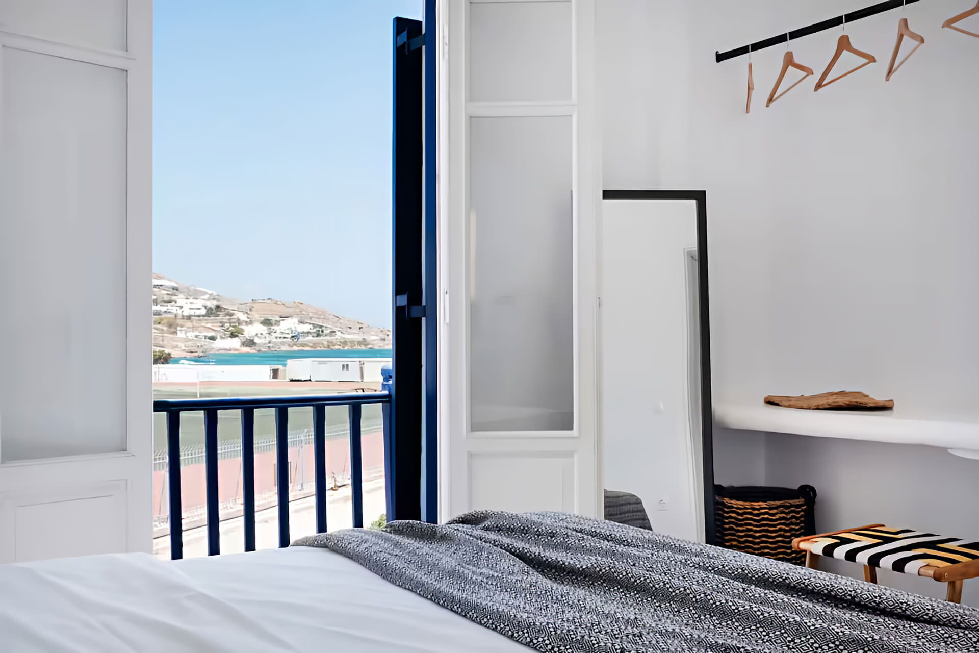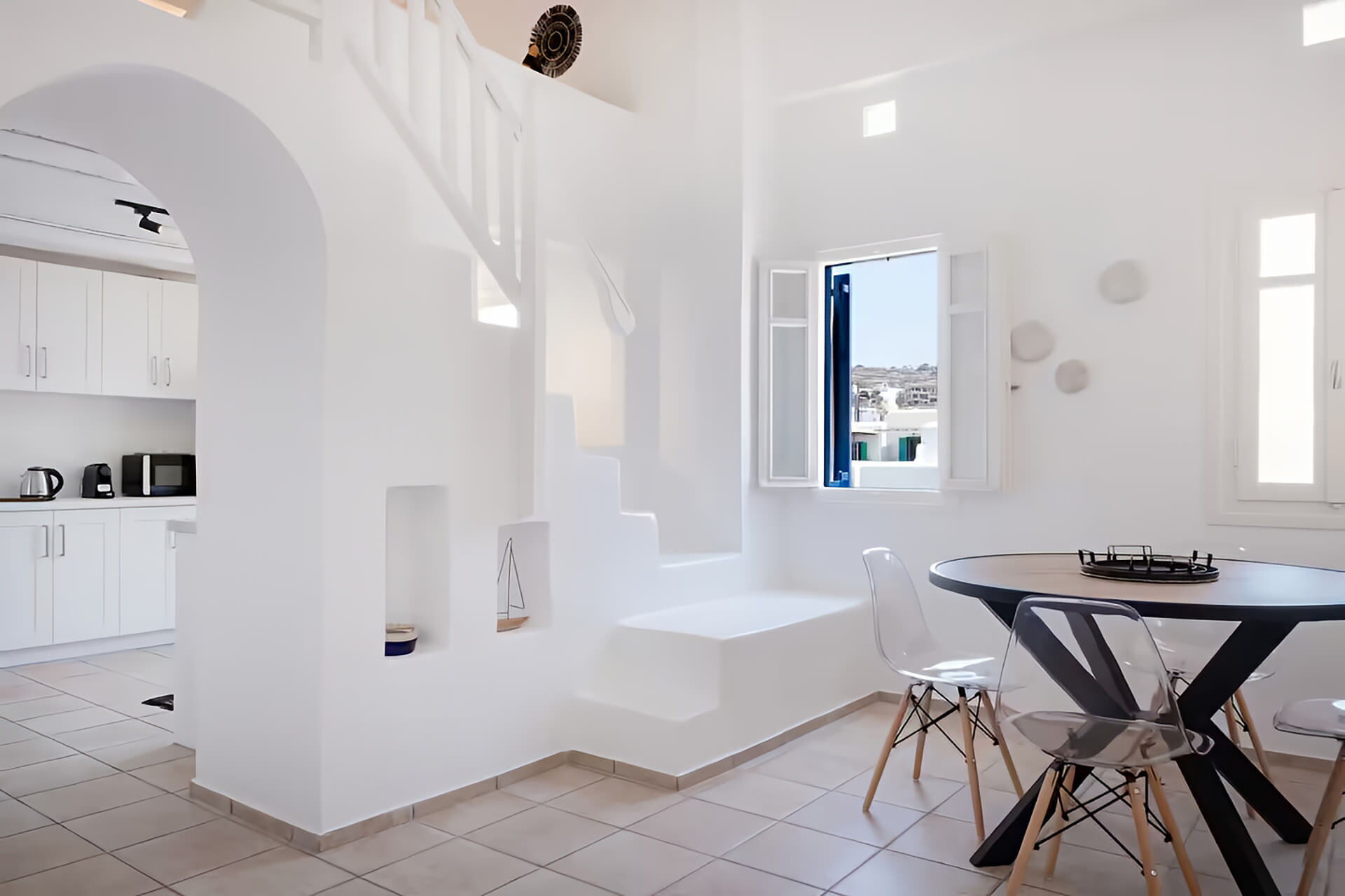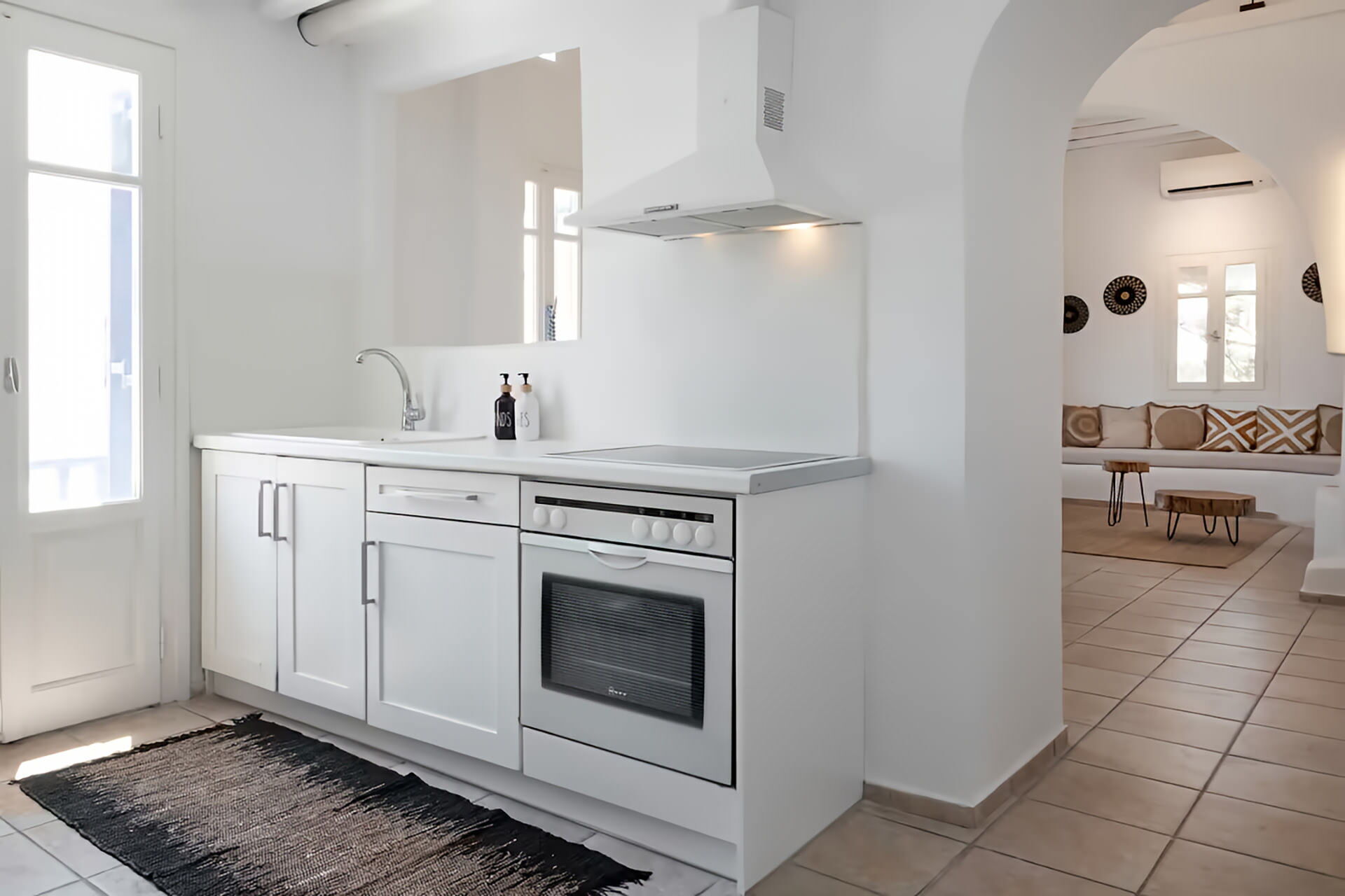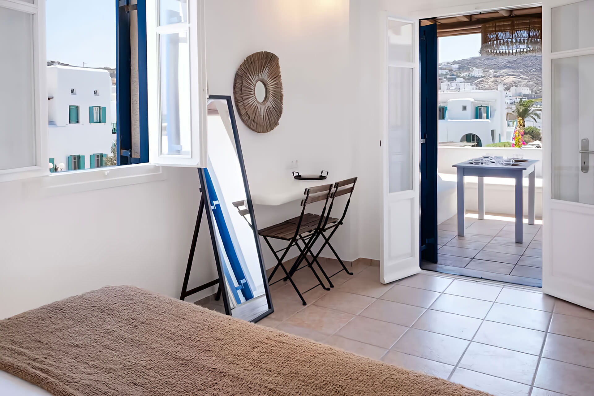 The apartment is equipped with air conditioning to keep the interiors cool during the warm Mykonos summers, as well as heating available for cooler periods, ensuring a comfortable stay throughout the year. A television is provided for entertainment during leisure hours indoors. The property is also pets friendly, welcoming guests who wish to travel with their animal companions. In addition, the apartment features a private outdoor veranda furnished with a table and chairs, offering a dedicated space for al fresco dining, morning coffee, or simply enjoying the fresh Aegean air in complete privacy.