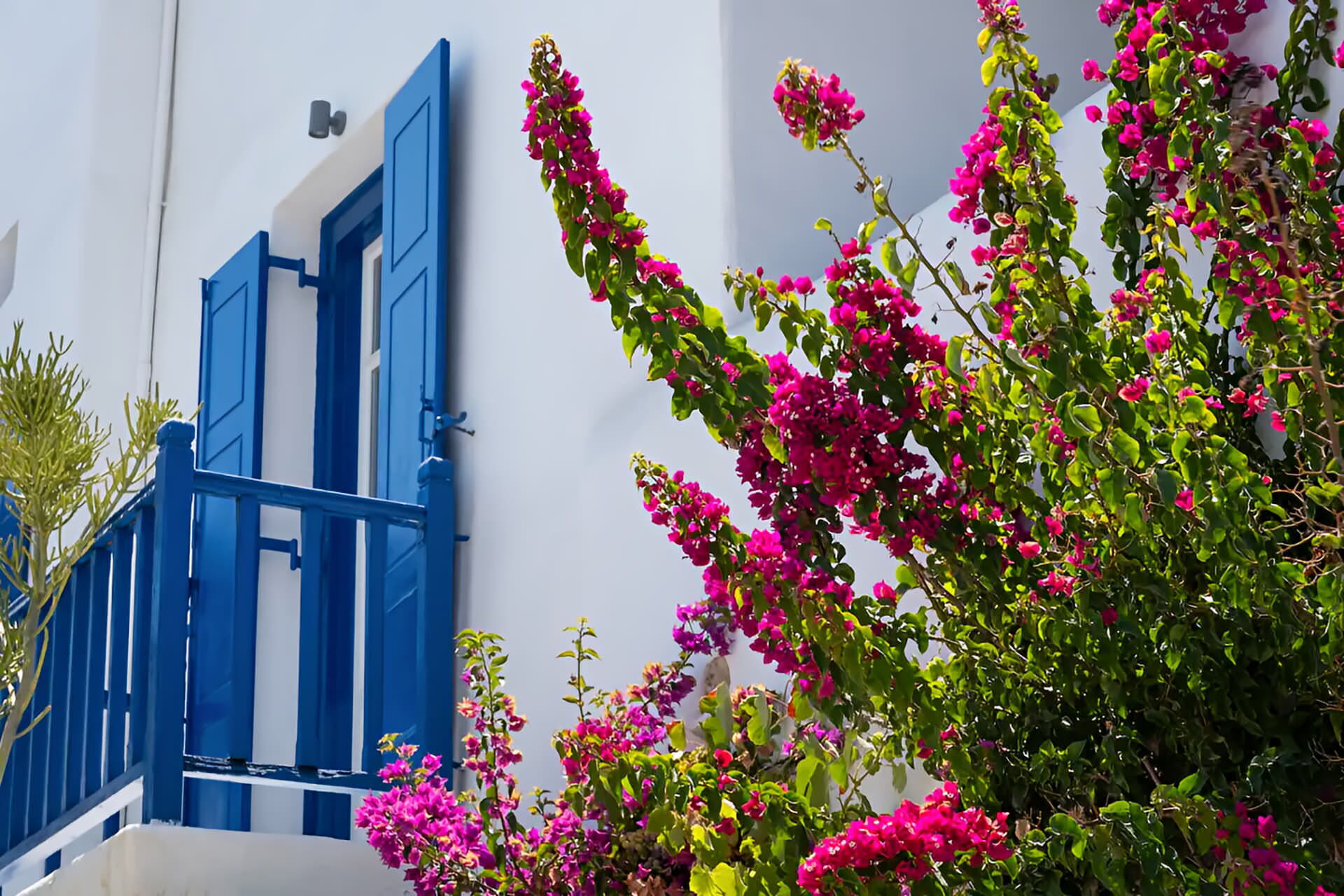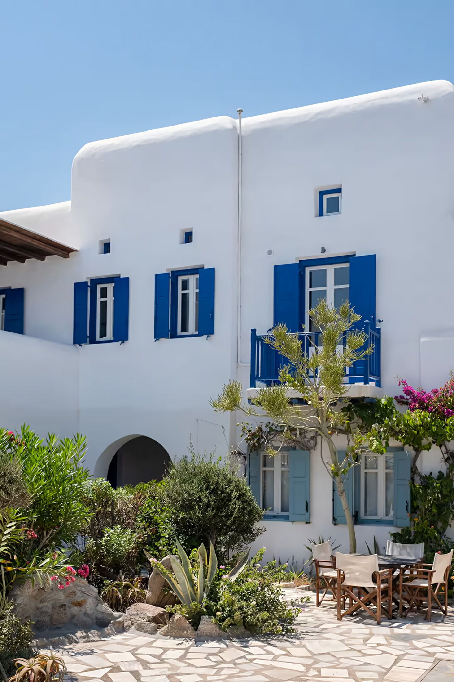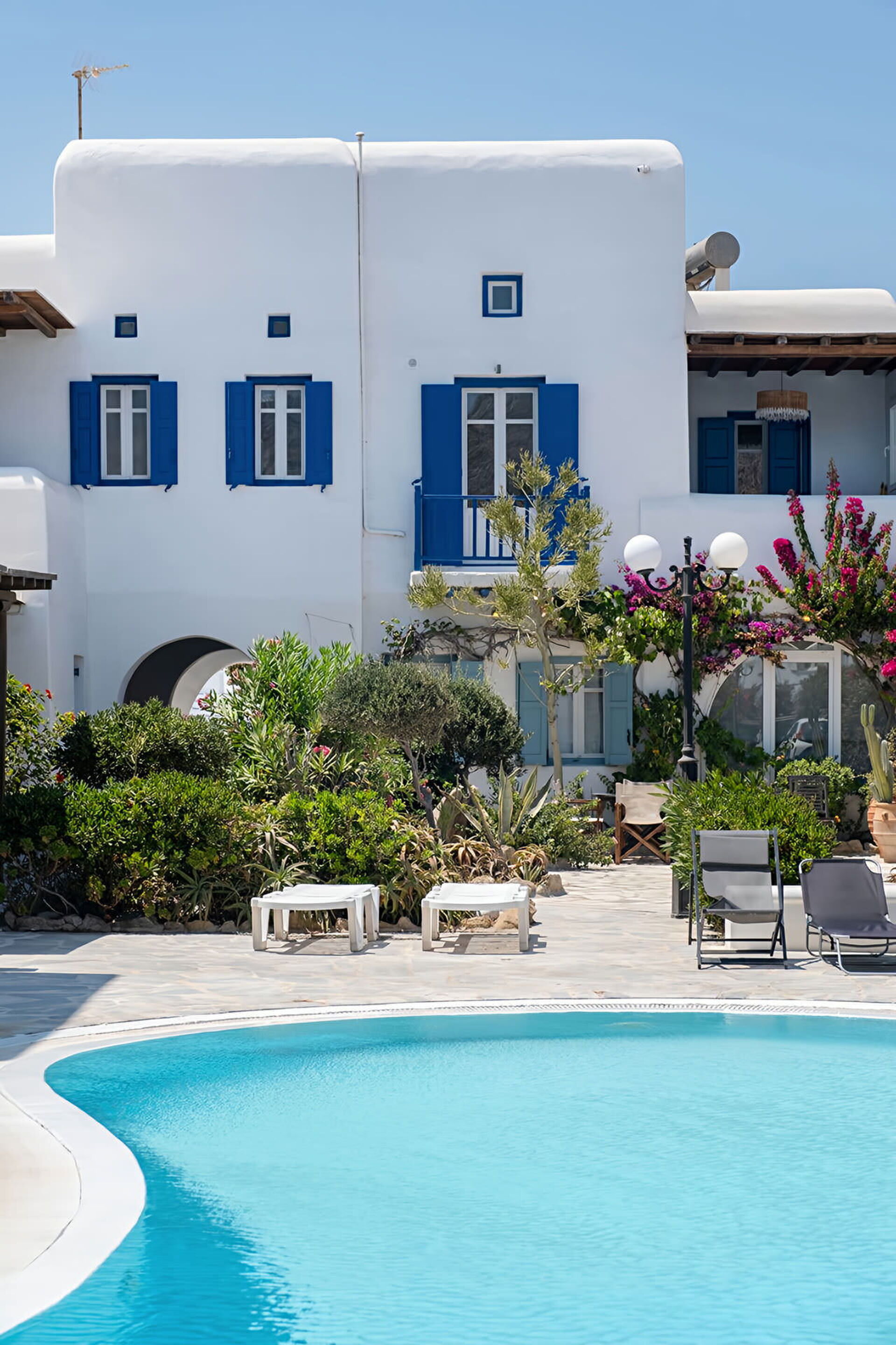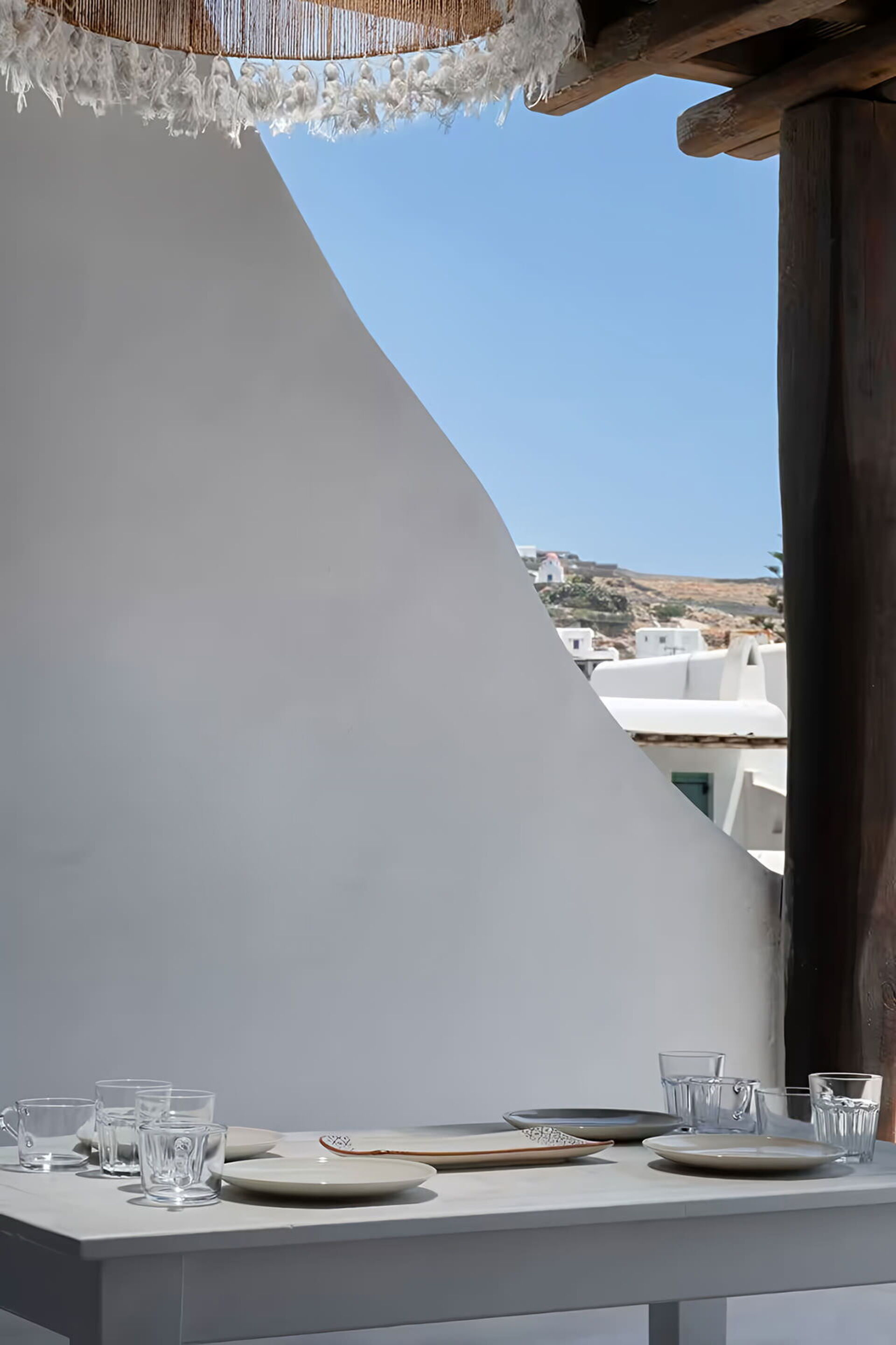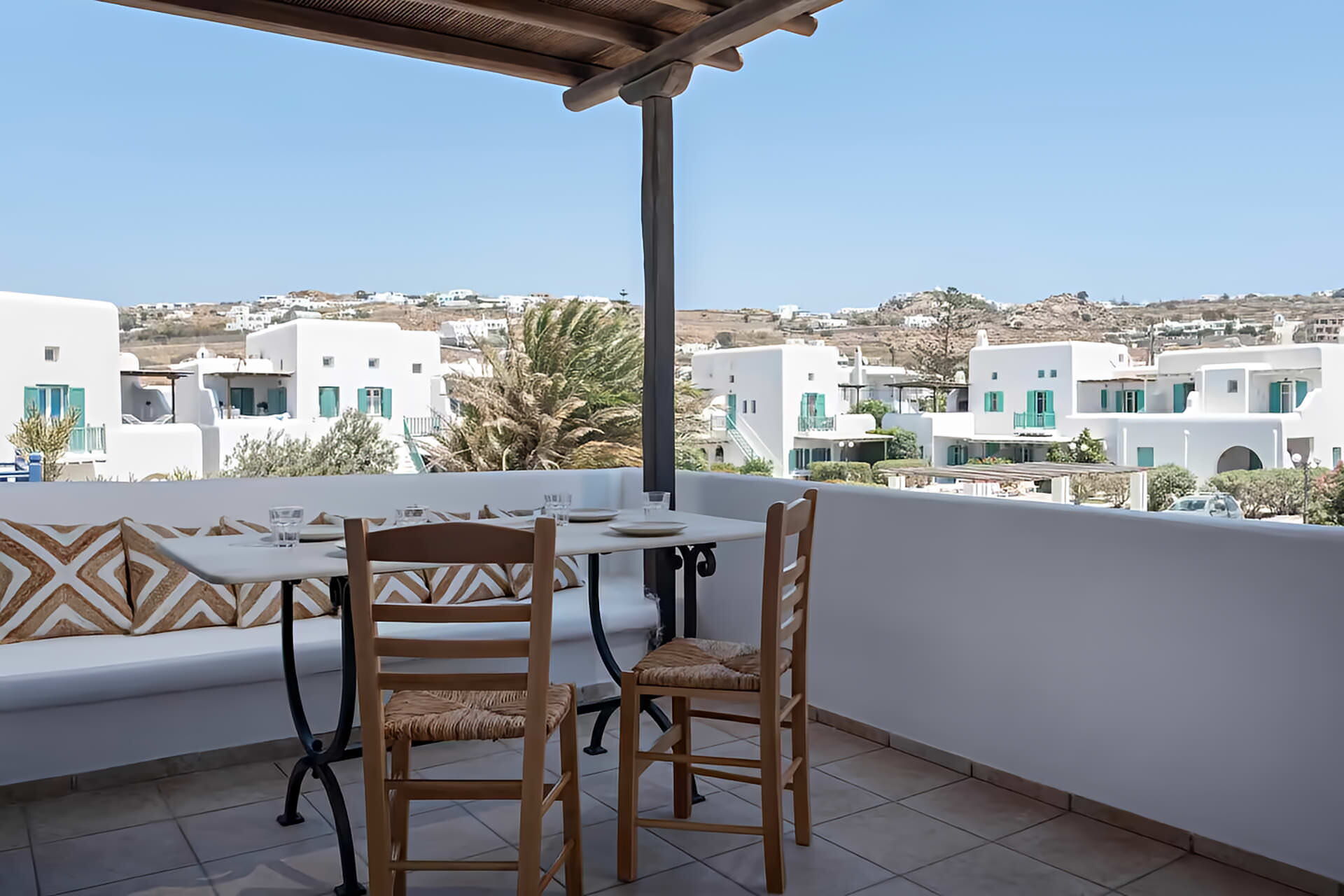 The outdoor spaces of this property are thoughtfully designed to make the most of the Mykonian climate and surroundings. A private veranda offers a dedicated area for outdoor dining and relaxation, with pleasant views over the pool, making it an ideal setting for morning coffee or sunset dining. The shared garden surrounding the swimming pool creates a peaceful green environment where guests can enjoy the warmth of the island in a communal yet respectful atmosphere. The shared swimming pool is available for use in accordance with the complex guidelines, with pool towels provided to ensure a complete and comfortable outdoor experience. Outdoor furniture on the veranda supports both leisurely moments and convivial dining, allowing you to fully embrace the outdoor lifestyle that Mykonos is celebrated for.