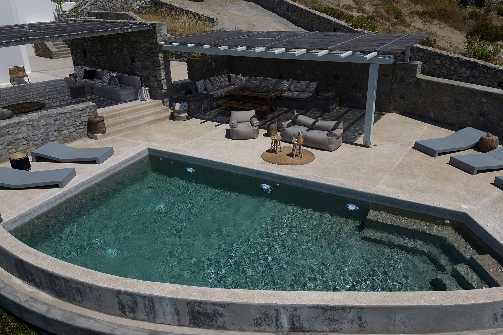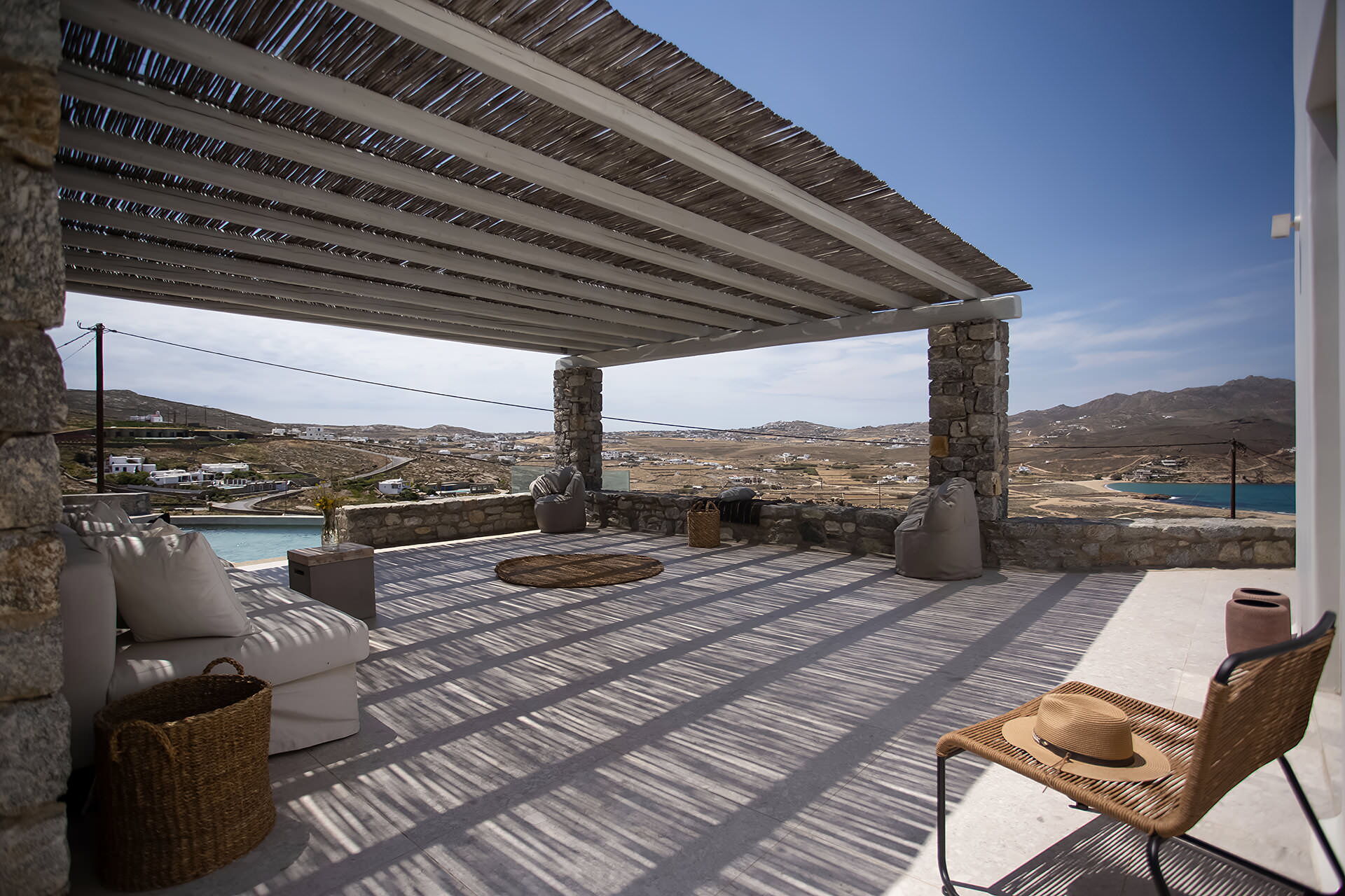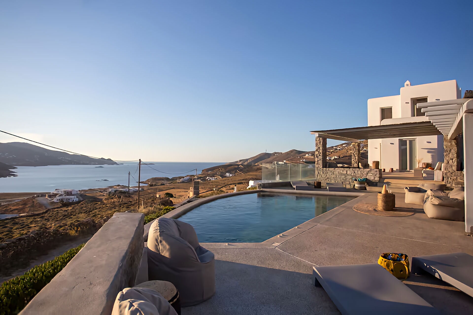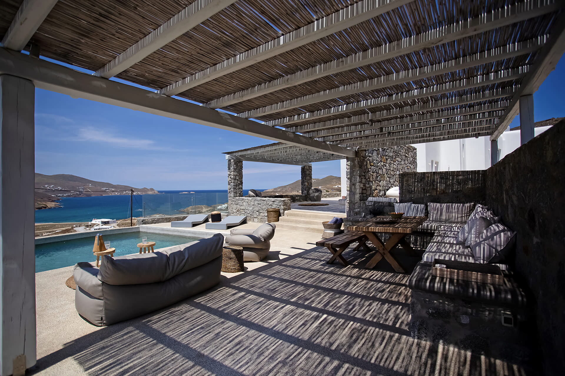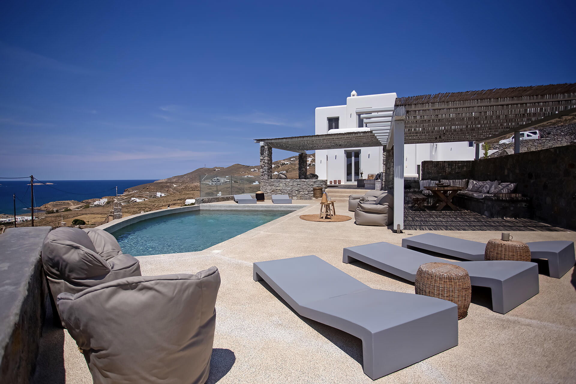 luxury rental home in Mykonos, with amazing sea view, private swimming pool, large garden and patio with outdoor dining facilities
