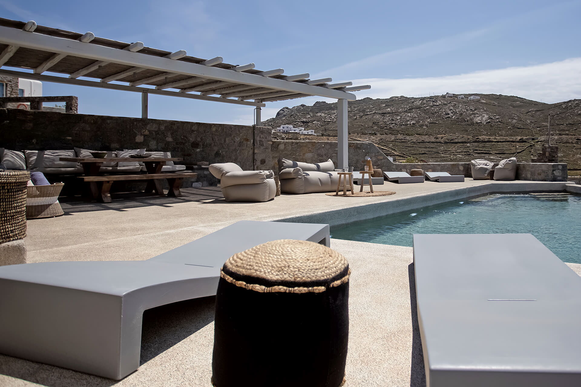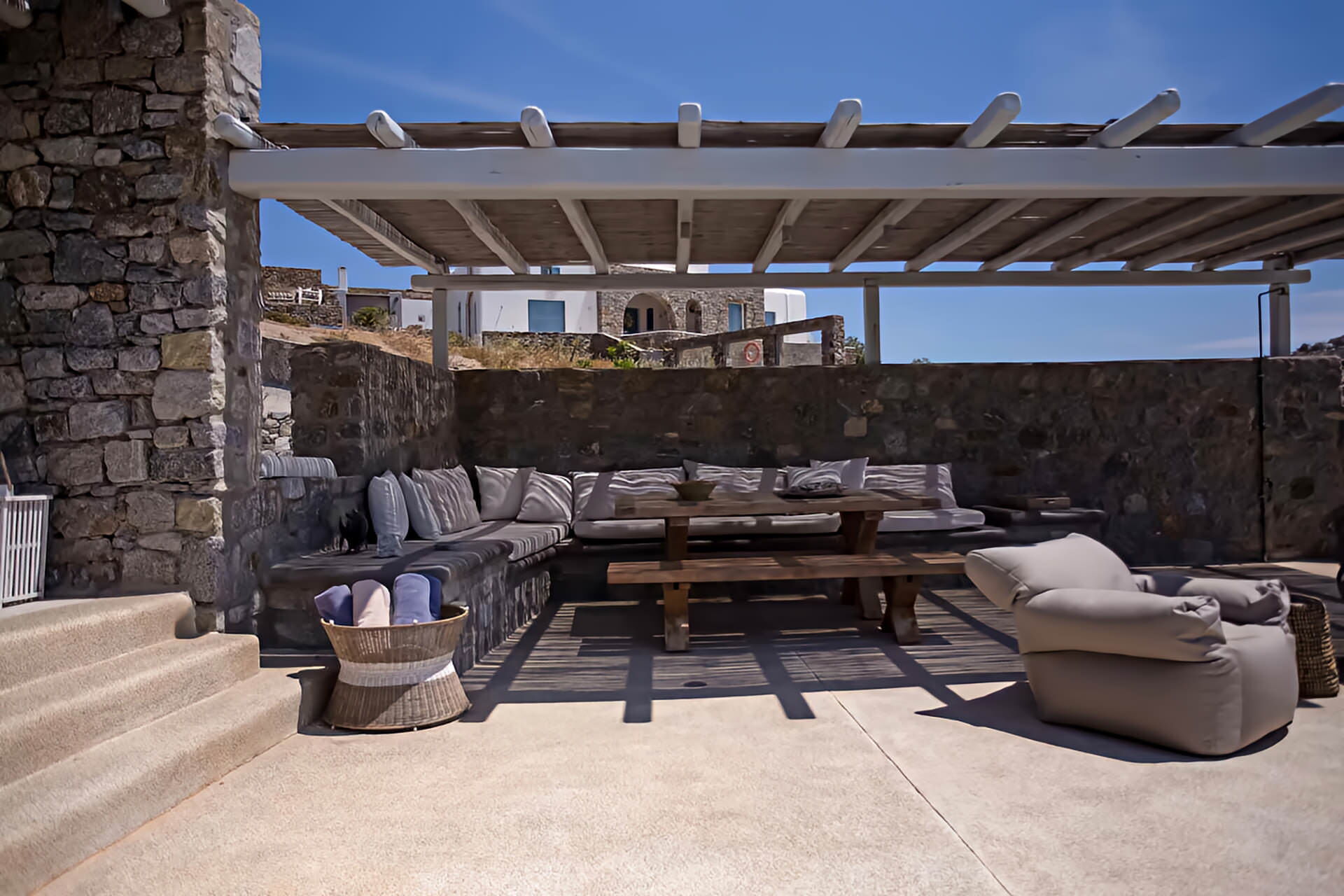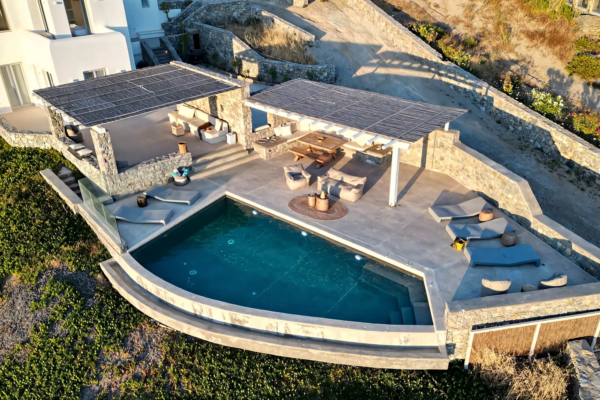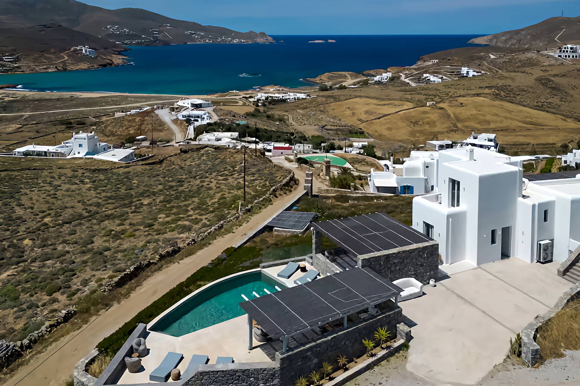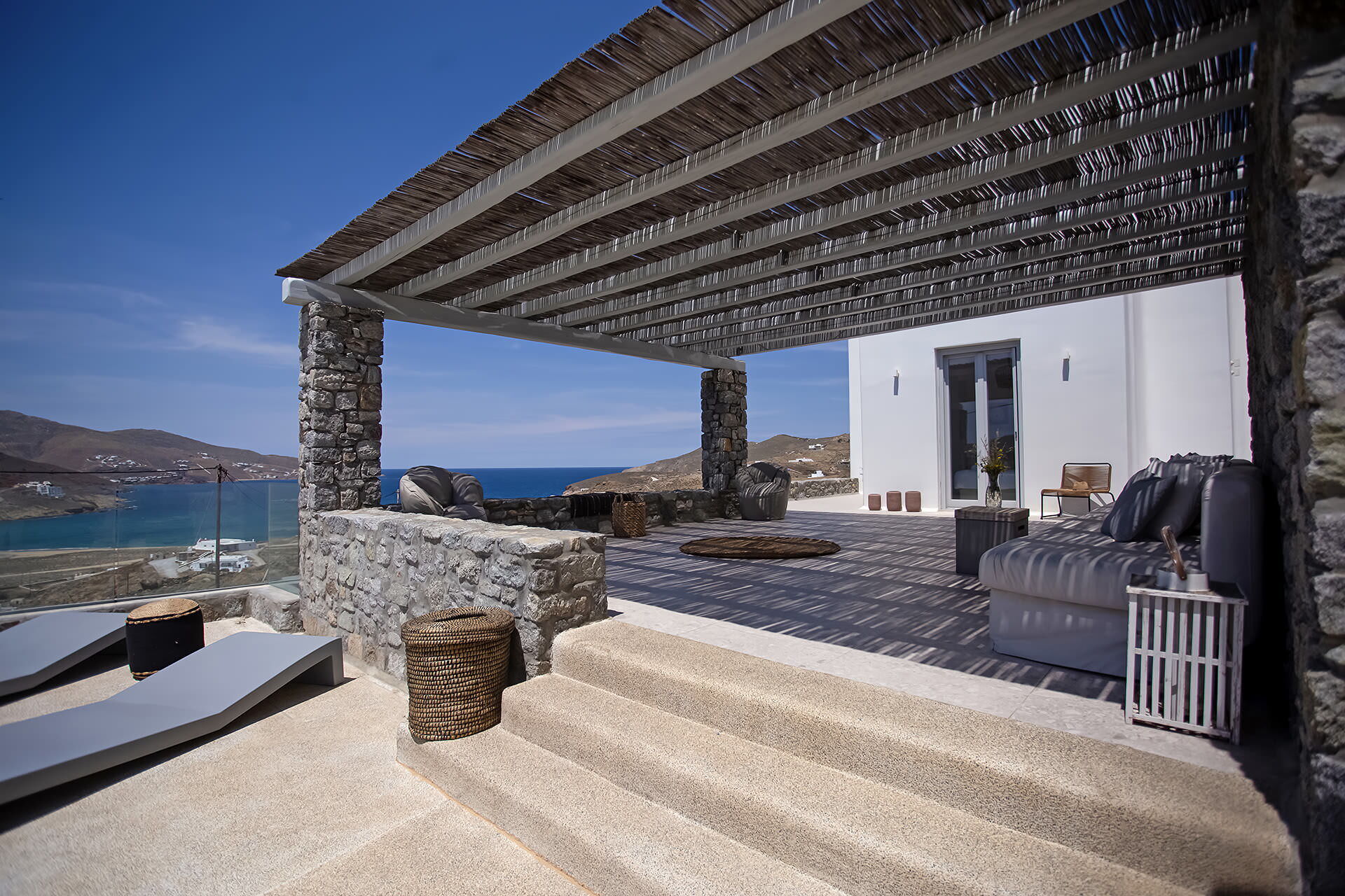 luxury rental home in Mykonos, with amazing sea view, private swimming pool, large garden and patio with outdoor dining facilities