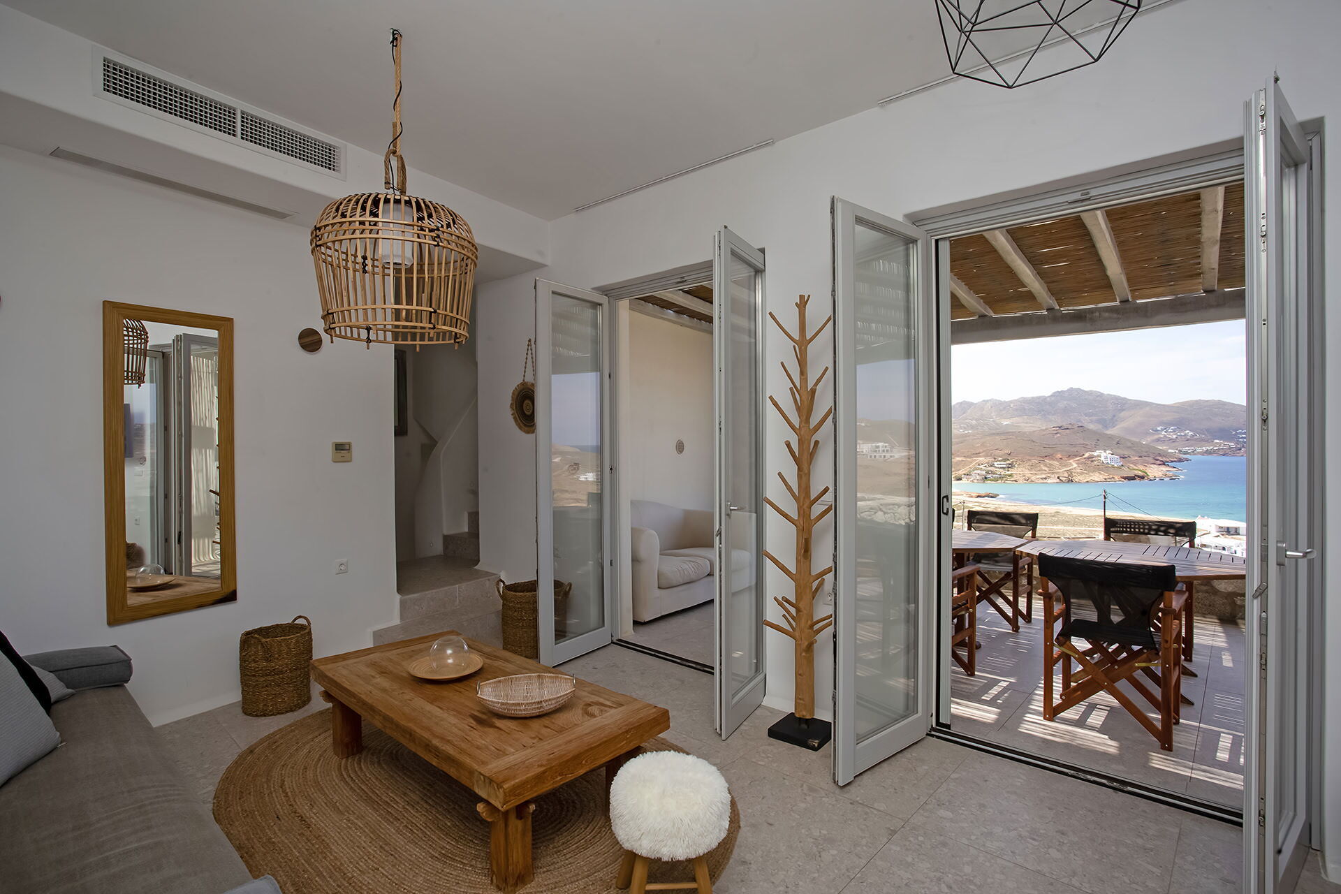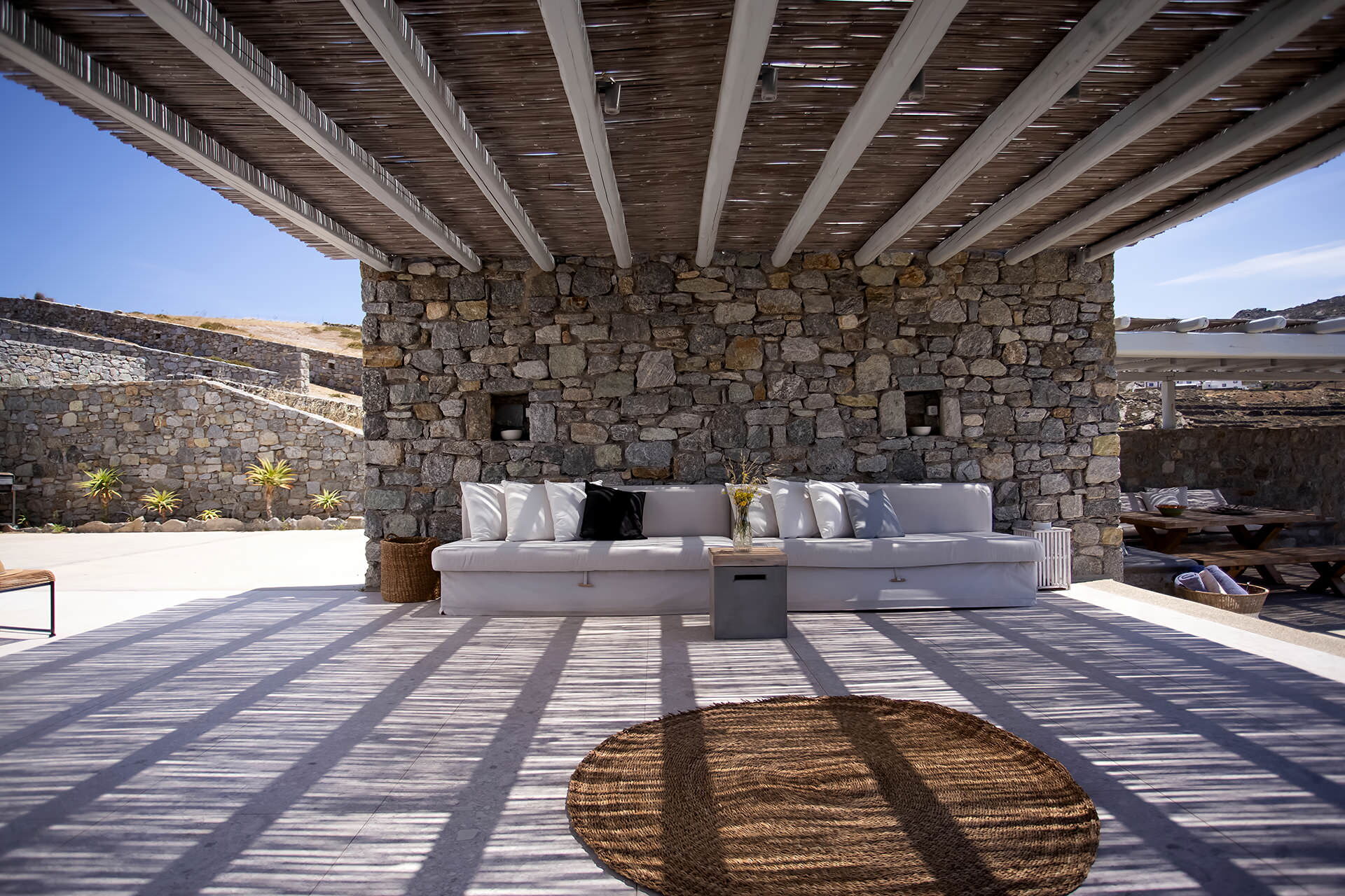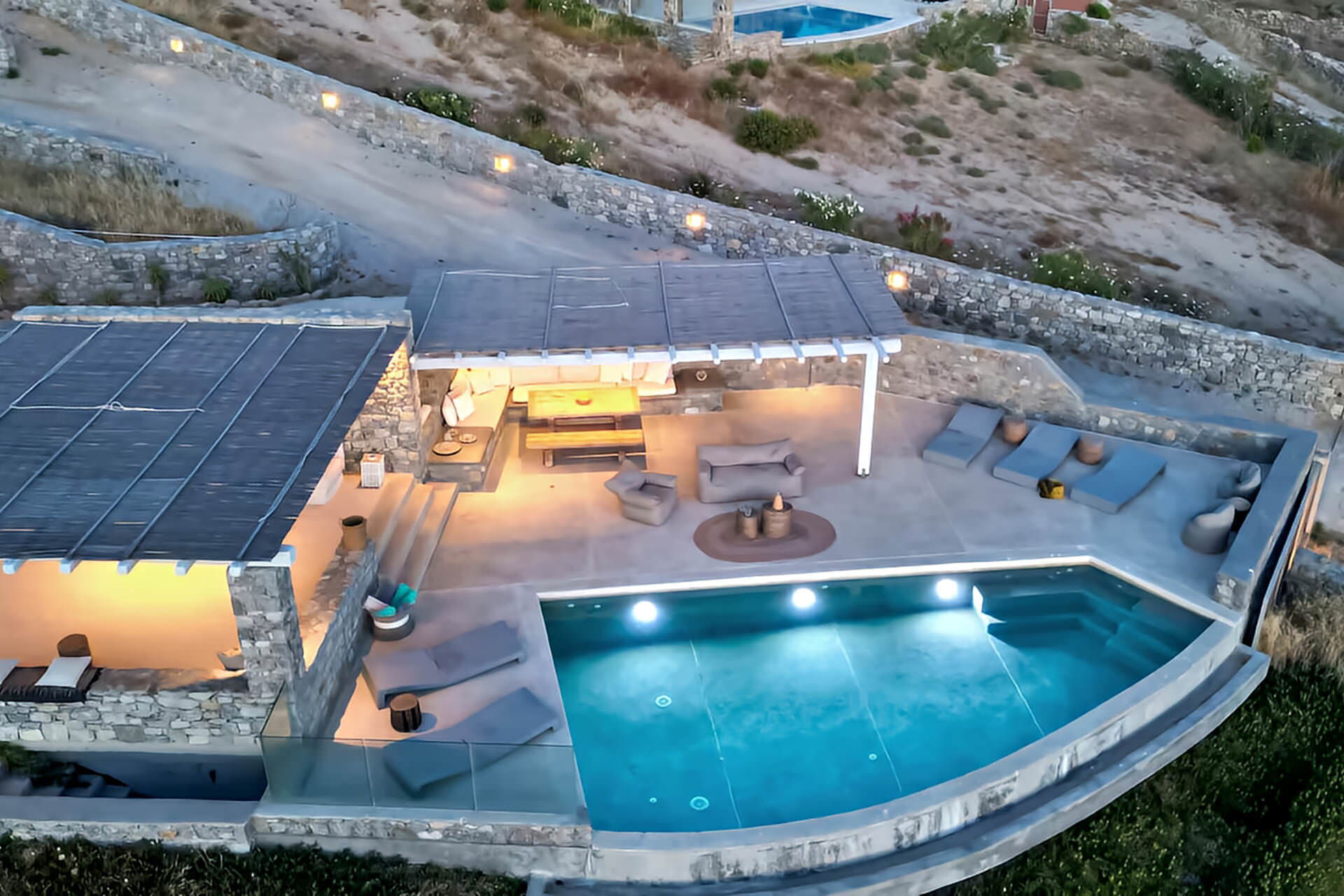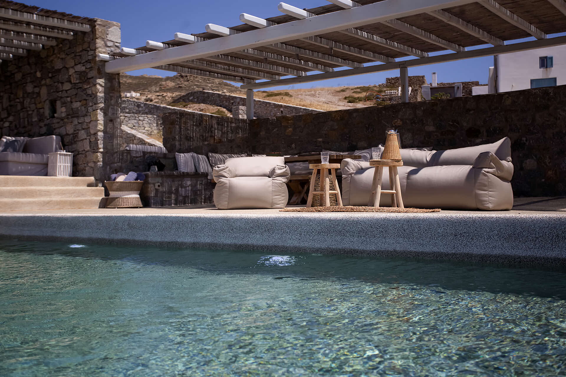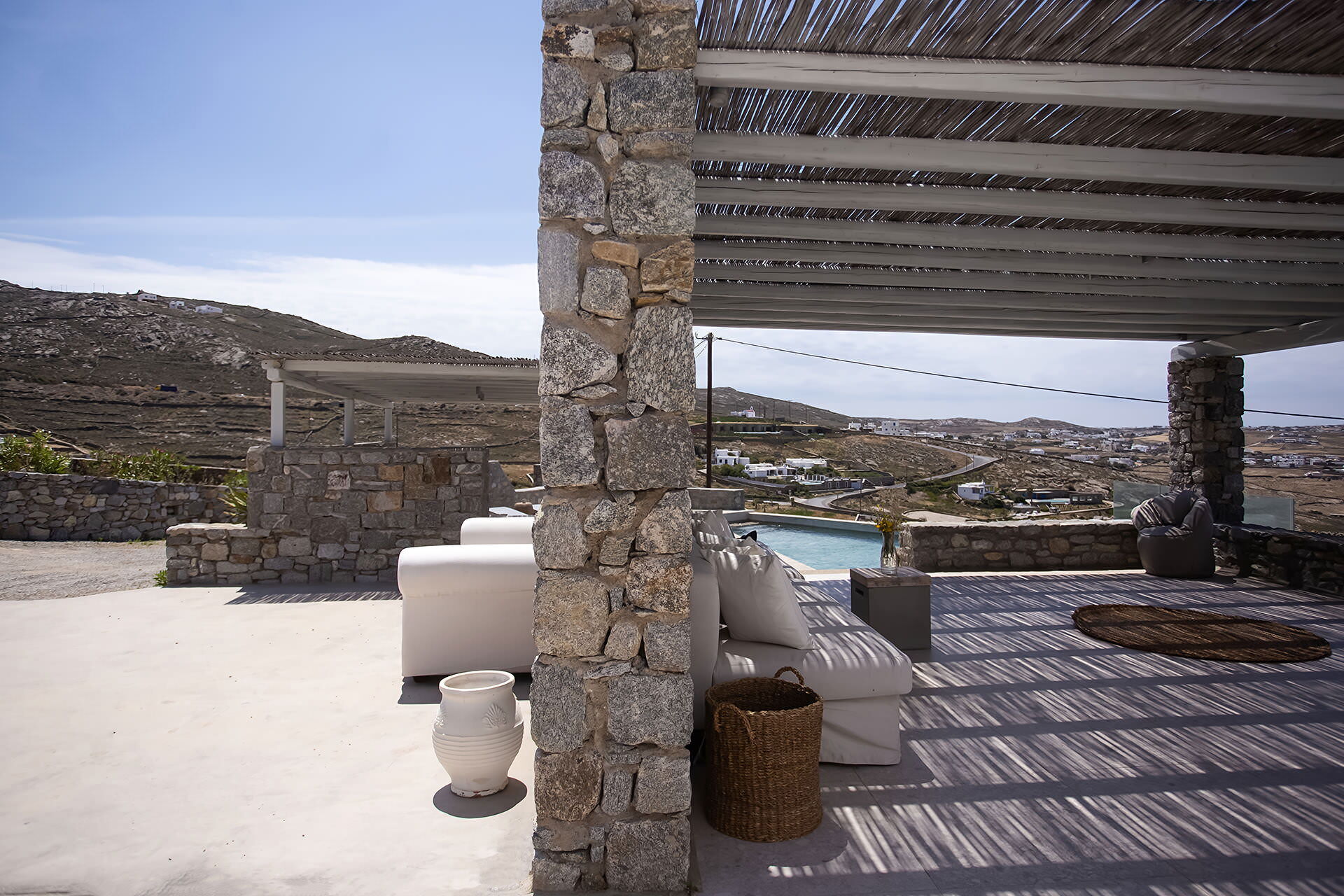 luxury rental home in Mykonos, with amazing sea view, private swimming pool, large garden and patio with outdoor dining facilities
