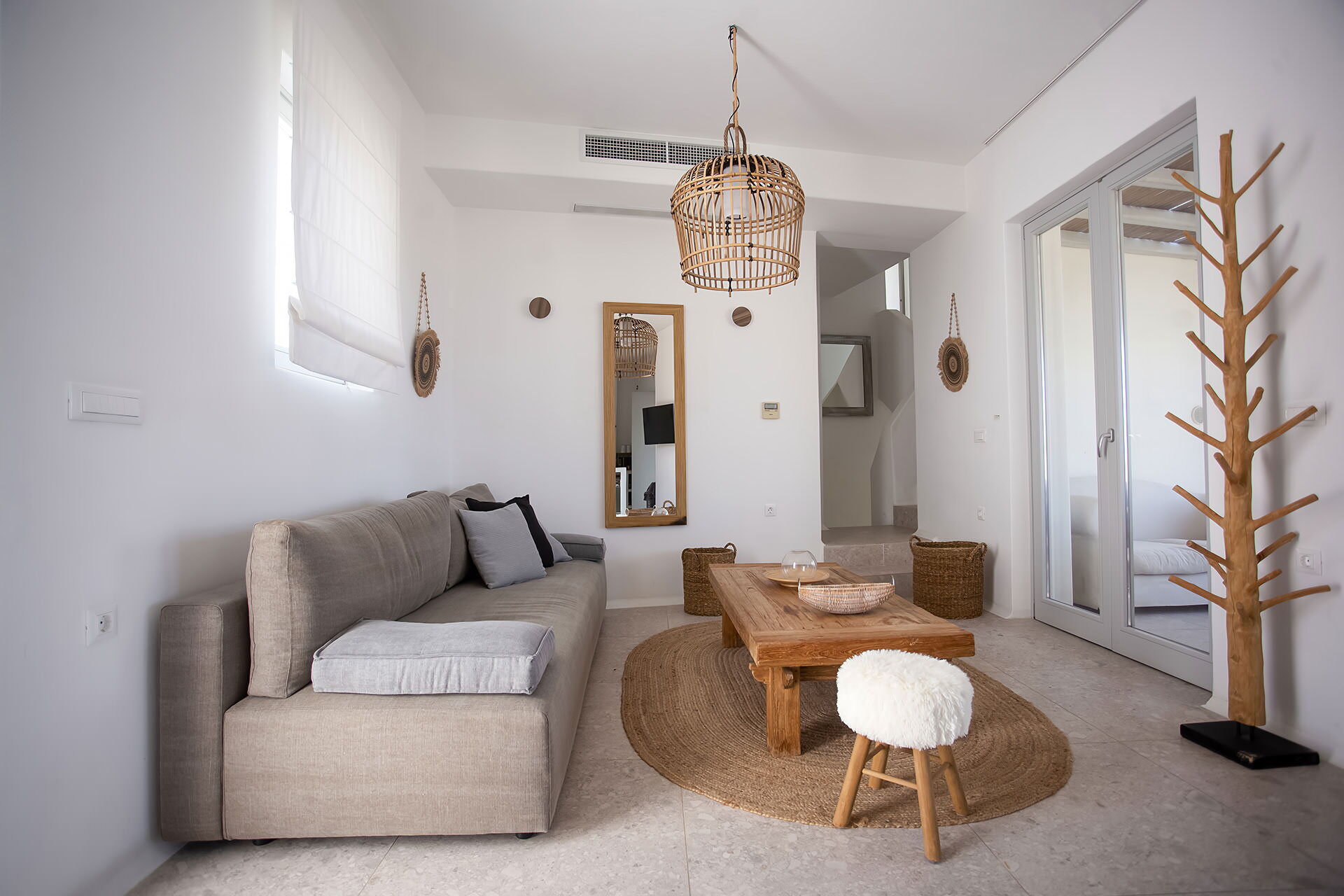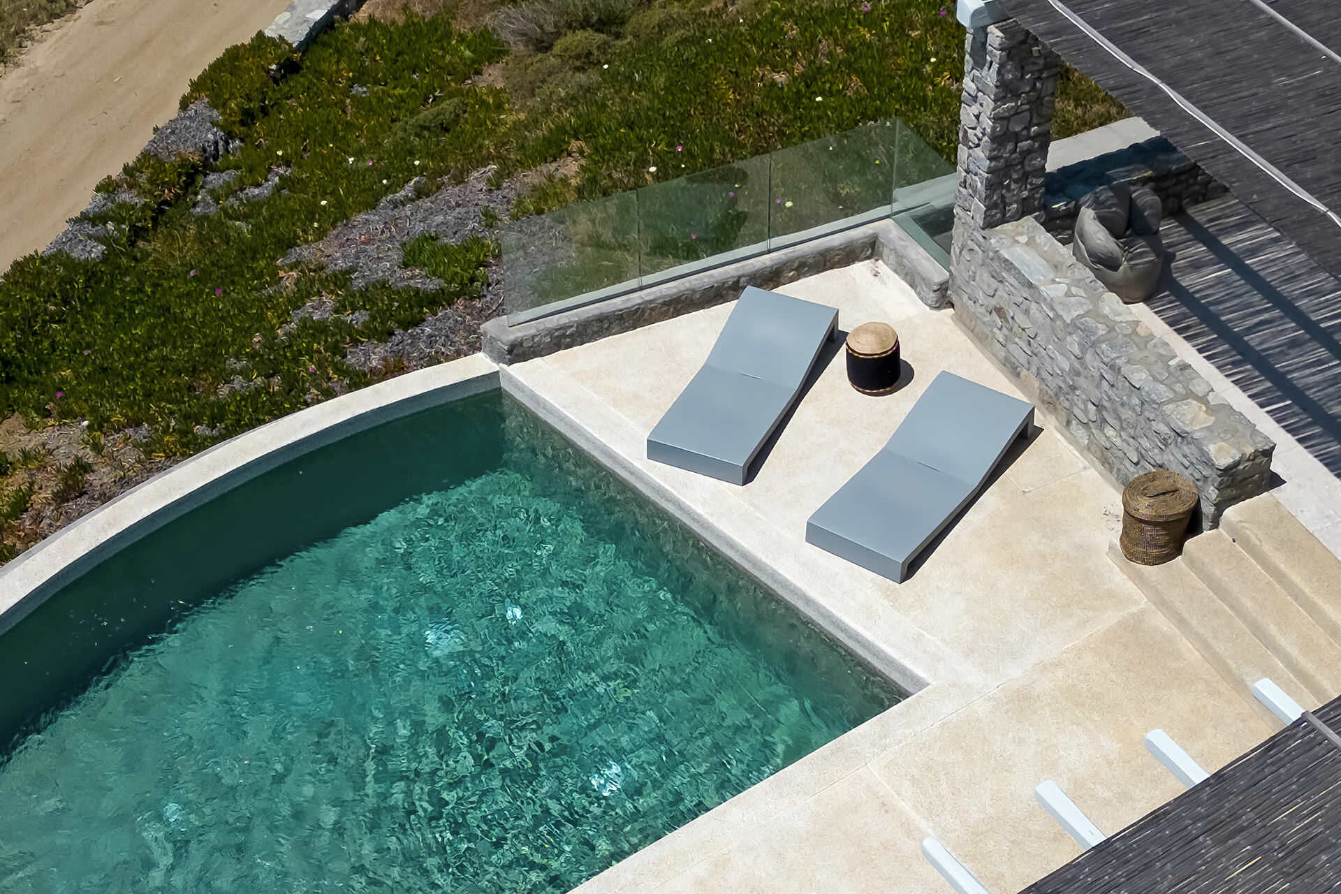 The outdoor spaces of Villa Cornelia 1 are truly exceptional. The centerpiece is a private infinity pool that appears to merge with the Aegean horizon, surrounded by comfortable sunbeds perfect for long, sun-drenched afternoons. A shaded al fresco dining area invites leisurely lunches and candlelit dinners, while the terrace furniture and garden spaces provide multiple settings for unwinding and socializing. The garden is thoughtfully designed to maximize privacy while framing the spectacular sea views, making every sunset an unforgettable experience.