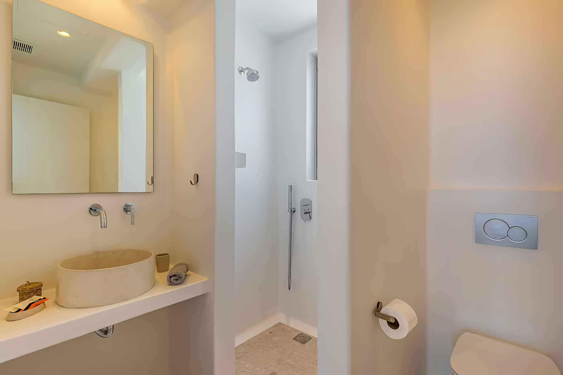 Villa Cornelia 1 extends over 180 square meters across 3 levels and comfortably accommodates up to 8 guests in 4 bedrooms and 4 bathrooms. On the ground floor, 2 queen bedrooms each feature an en-suite bathroom with basin, toilet, shower, and hairdryer, along with direct access to the pool area and garden. One of these bedrooms also benefits from a private entrance. The mezzanine level hosts a bright living room, a fully equipped kitchen, a dining area, and a separate full bathroom. On the first floor, 2 additional queen bedrooms are offered, one with an en-suite bathroom and sea view, and one enjoying both sea and pool views, with an additional bathroom serving this level.