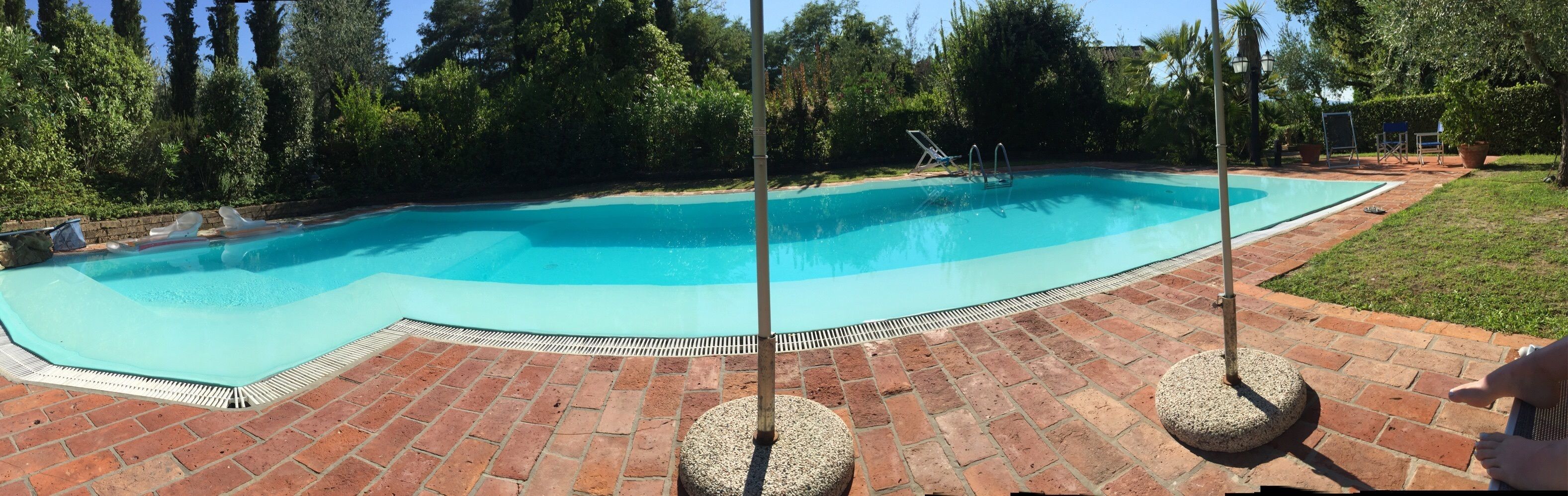 The house, which is located on the same estate as Le Rondini (also in our program), is surrounded by a very large and well maintained flat garden, where an unusually big pool for such a small house is situated. The pool has a salted water filter system avoiding the use of chlorine. The garden is fenced all around, making it very safe for children, and there is also a children’s play area.