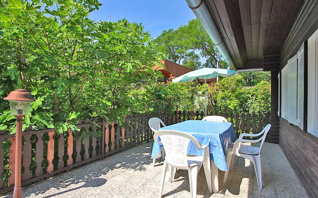 Balatonmária: Chalet "Cabinette", built in 1992, renovated in 2015. In the resort, in a central, quiet position, 100 m from the lake, located by a road. Private: garden 500 m2 (fenced) trees, lawn for sunbathing. Grocery 50 m, restaurant 100 m, railway station 200 m, outdoor swimming pool 100 m, thermal baths 13 km. Sports harbour 100 m.