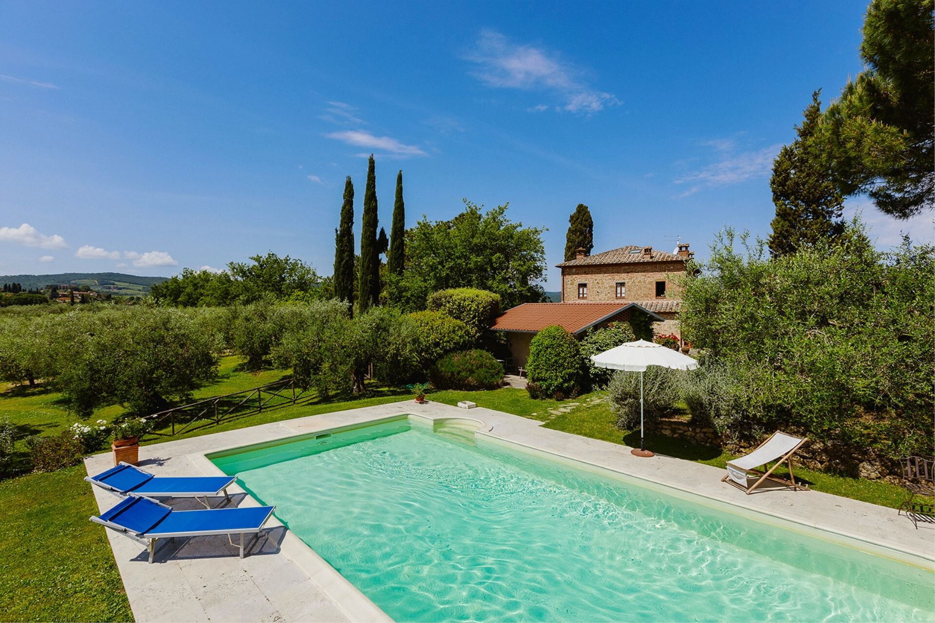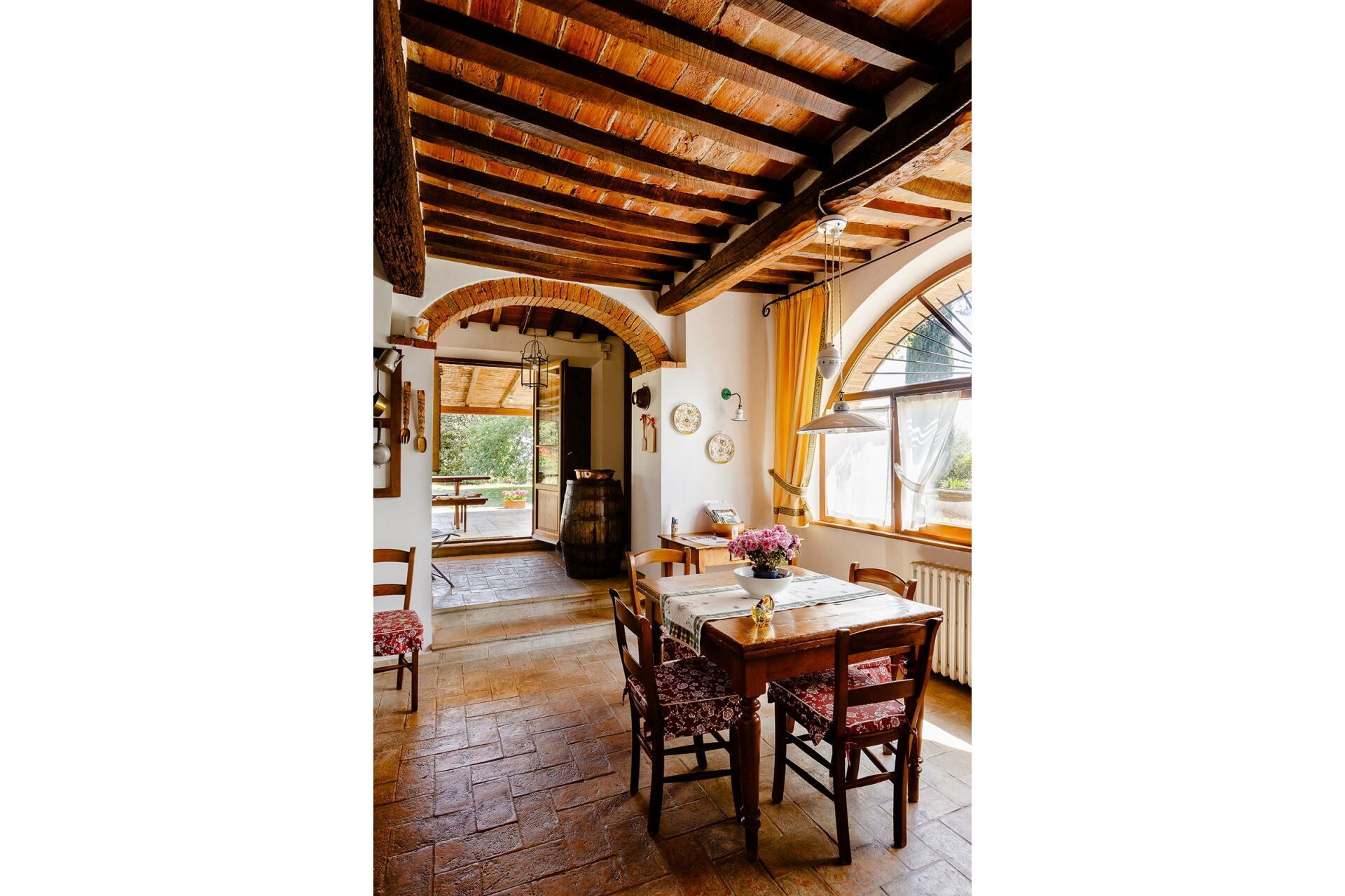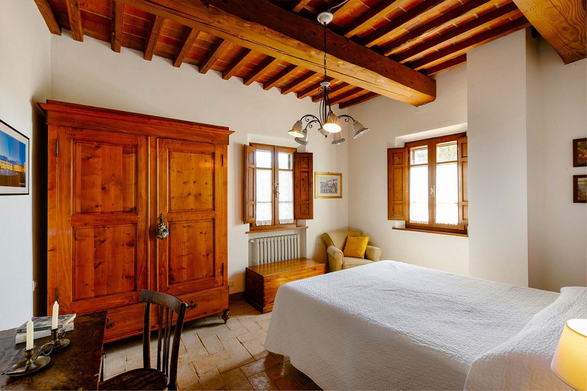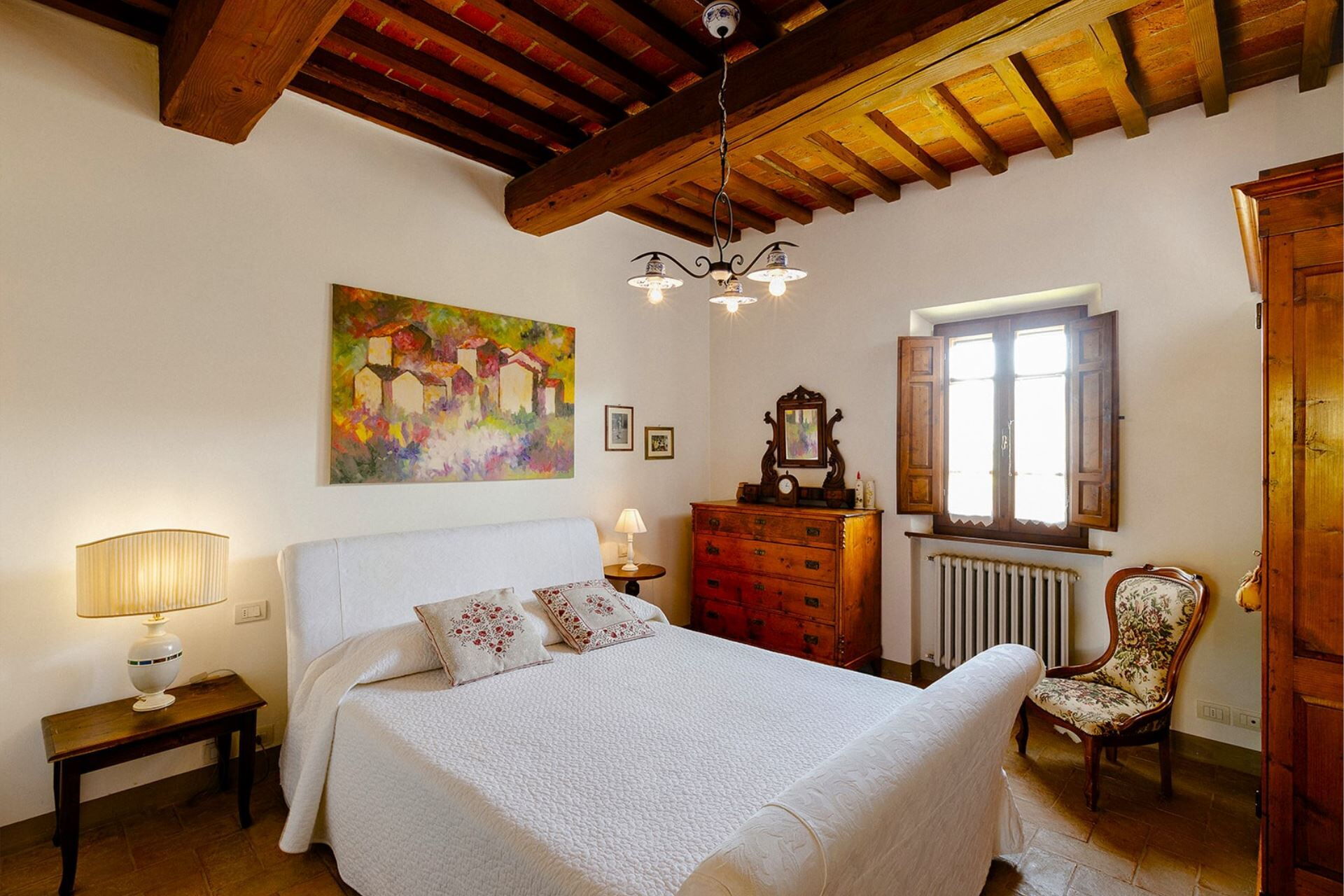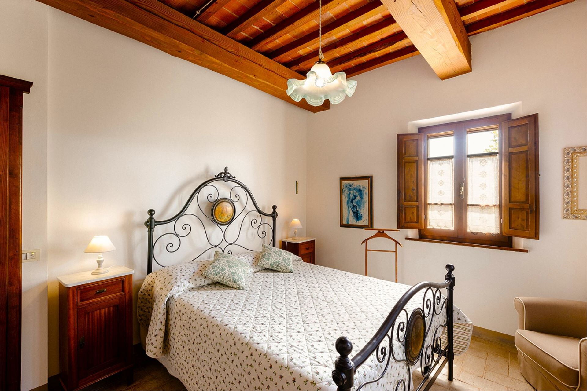 A spacious garden hugged by cypresses and other densely green trees, views of rolling hills and lush Tuscan landscapes all around, a private pool, a terracotta roof, a pretty and traditional Tuscan kitchen, charming bedrooms finished with detail and care, high exposed-beam ceilings, a nice little covered area for dining al fresco, lots of rooms with direct exits out onto the terrace... all of this and more is what you can expect from the gorgeous and wonderfully and typically Tuscan Villa La Fragola (meaning Strawberry Villa) just 500m outside the village of Chianacce, 19km (12 miles) from Montepulciano. Positioned in an especially scenic and peaceful part of the world that is ideal for those looking to get away from it all and relax on their vacation, this gem allows you to get a real taste of the charming and slow-paced life of rural Tuscany while also being ideally located just 5km from the highway and allowing easy access to many of the region’s most famous destinations and attractions. Those who choose Villa La Fragola, therefore, will get the best of both worlds – the restful escape into the dreamy Tuscan countryside and plenty of opportunities to play the serious tourist and tick some key sights off of your bucket list. In addition to Montepulciano being just 19km (12 miles) away, other nearby cities include Cortona 20km (12 miles) away, Arezzo 45km (28 miles) away, Montalcino 52km (32 miles) away, and Perugia 62km (39 miles) away.