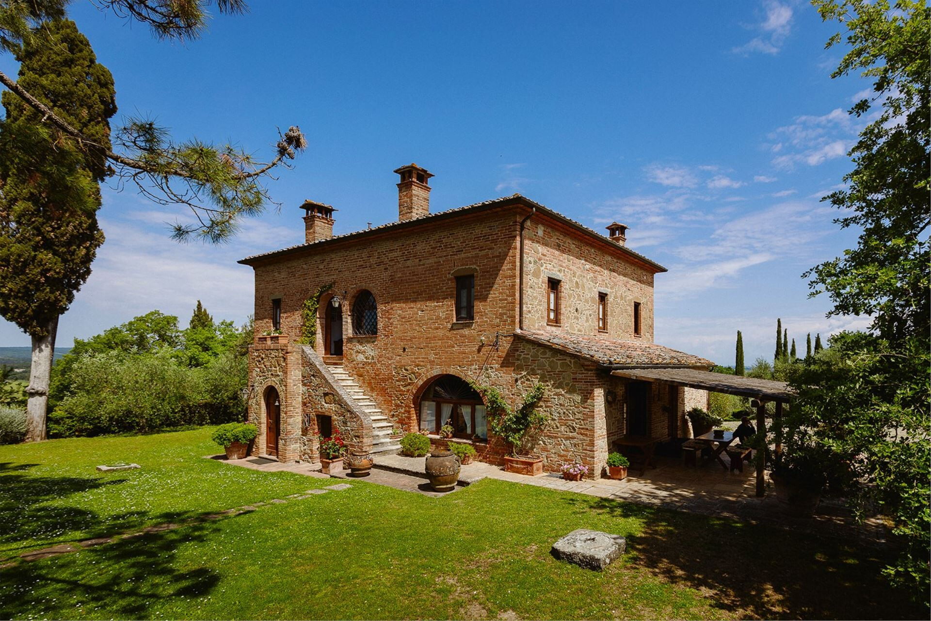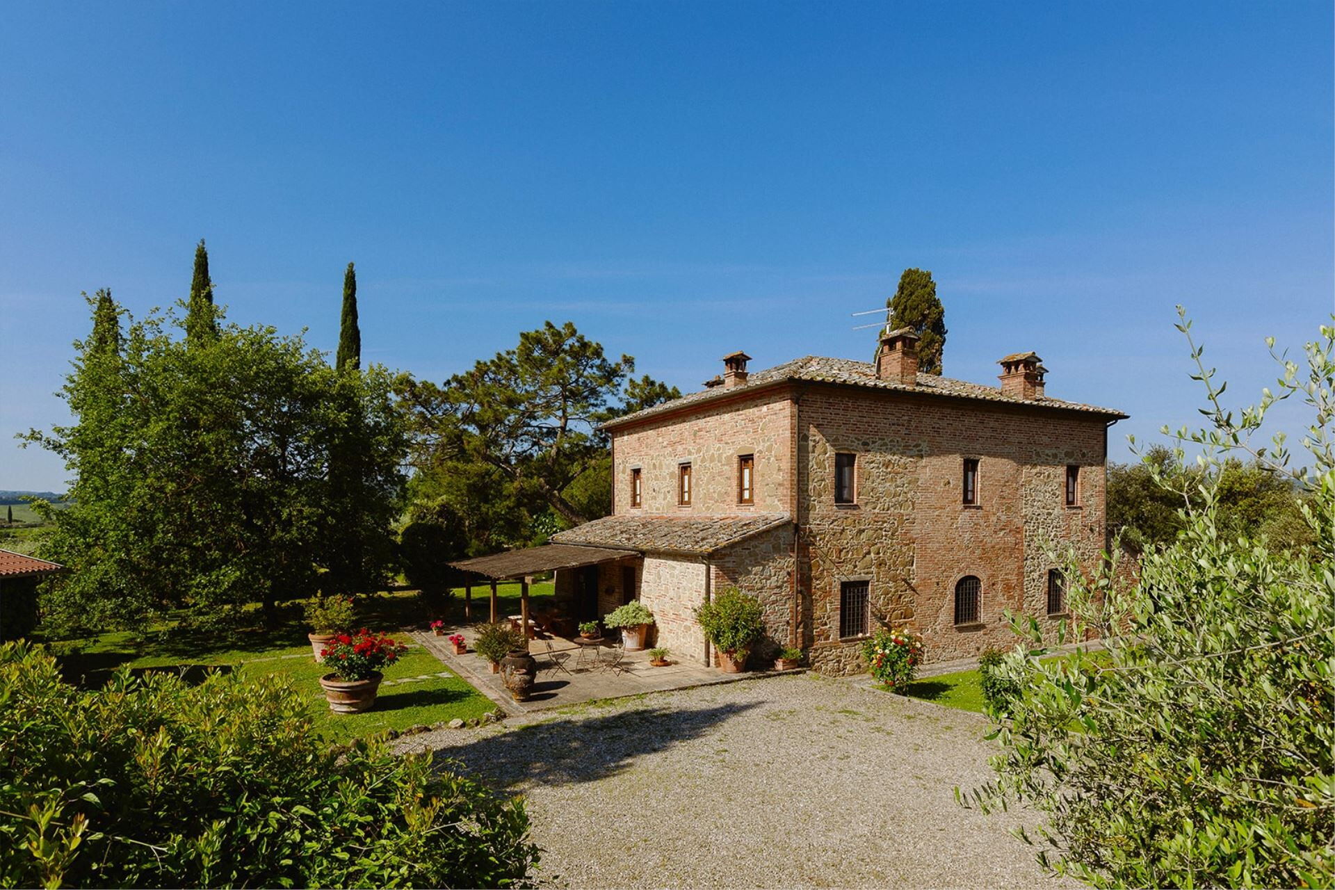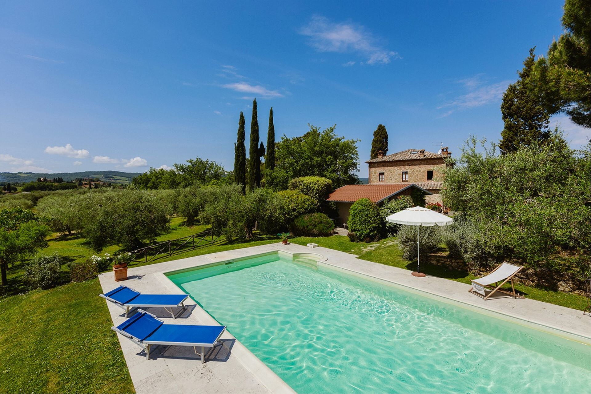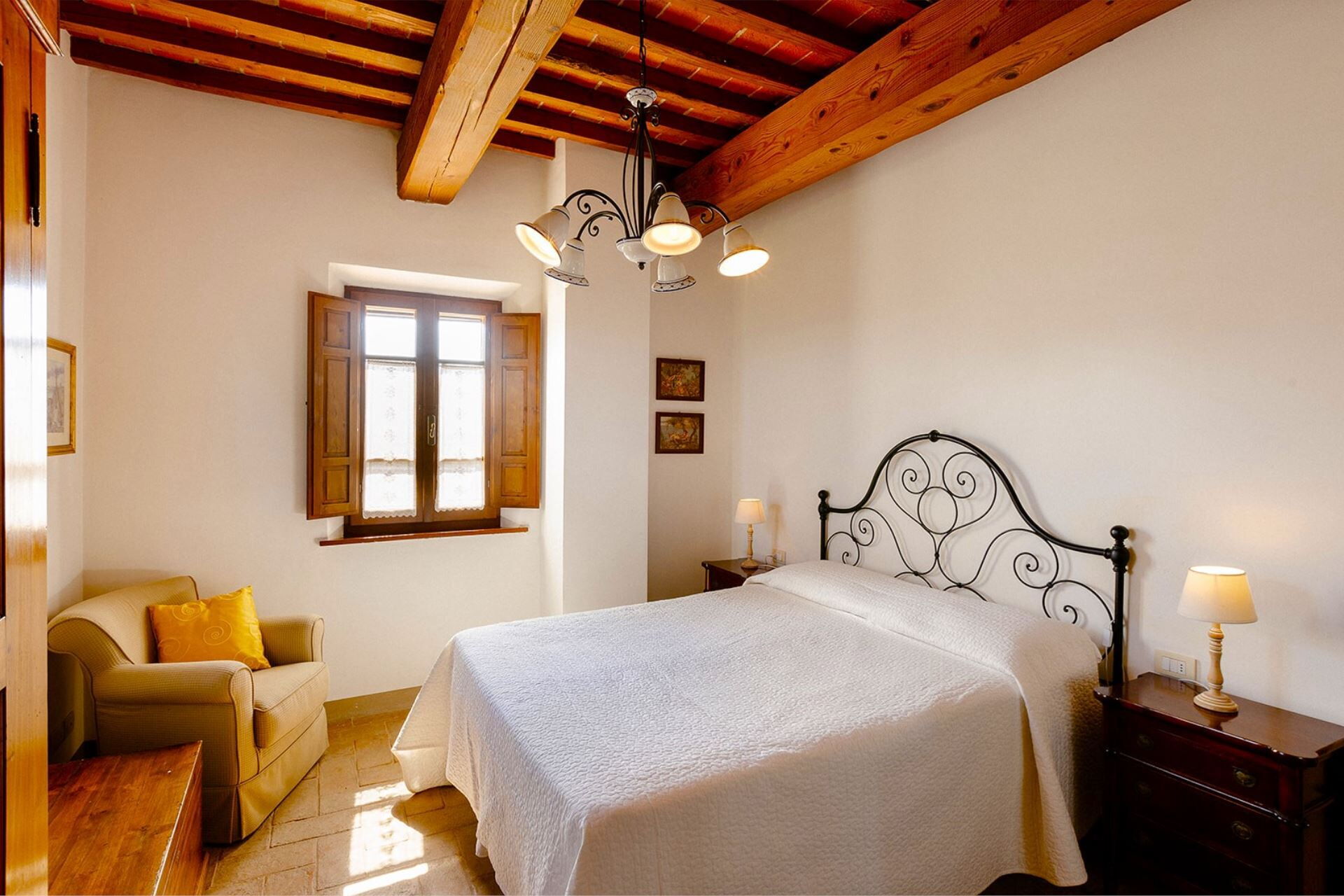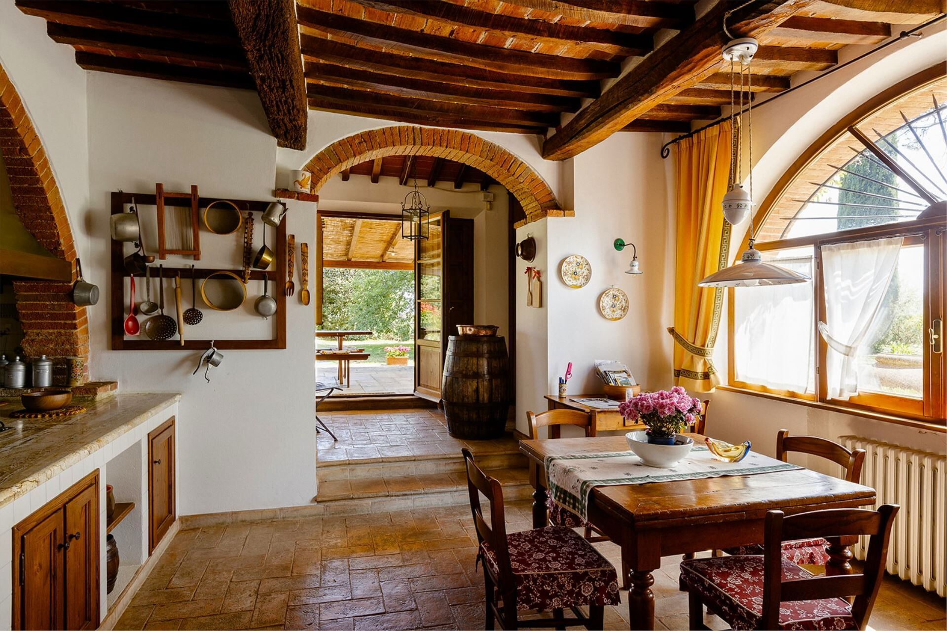 A spacious garden hugged by cypresses and other densely green trees, views of rolling hills and lush Tuscan landscapes all around, a private pool, a terracotta roof, a pretty and traditional Tuscan kitchen, charming bedrooms finished with detail and care, high exposed-beam ceilings, a nice little covered area for dining al fresco, lots of rooms with direct exits out onto the terrace... all of this and more is what you can expect from the gorgeous and wonderfully and typically Tuscan Villa La Fragola (meaning Strawberry Villa) just 500m outside the village of Chianacce, 19km (12 miles) from Montepulciano. Positioned in an especially scenic and peaceful part of the world that is ideal for those looking to get away from it all and relax on their vacation, this gem allows you to get a real taste of the charming and slow-paced life of rural Tuscany while also being ideally located just 5km from the highway and allowing easy access to many of the region’s most famous destinations and attractions. Those who choose Villa La Fragola, therefore, will get the best of both worlds – the restful escape into the dreamy Tuscan countryside and plenty of opportunities to play the serious tourist and tick some key sights off of your bucket list. In addition to Montepulciano being just 19km (12 miles) away, other nearby cities include Cortona 20km (12 miles) away, Arezzo 45km (28 miles) away, Montalcino 52km (32 miles) away, and Perugia 62km (39 miles) away.