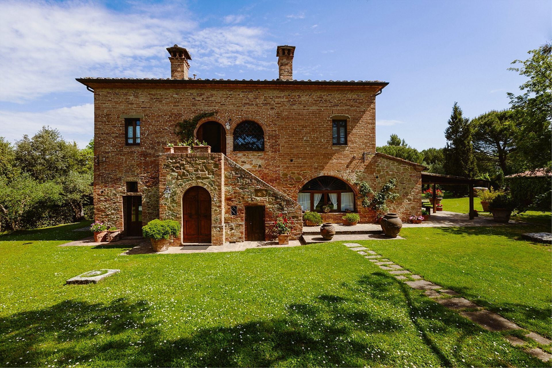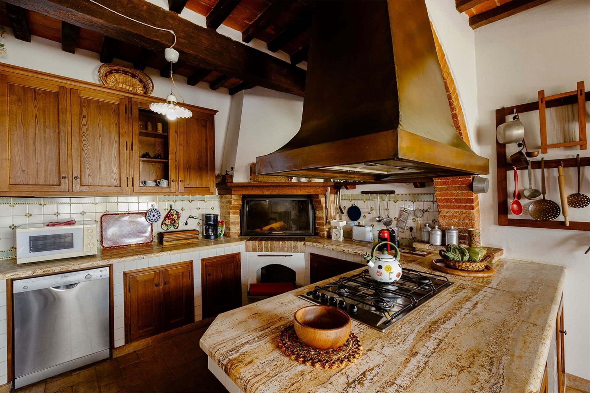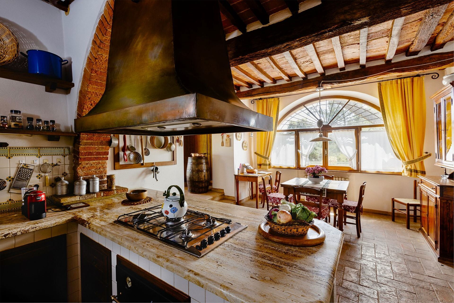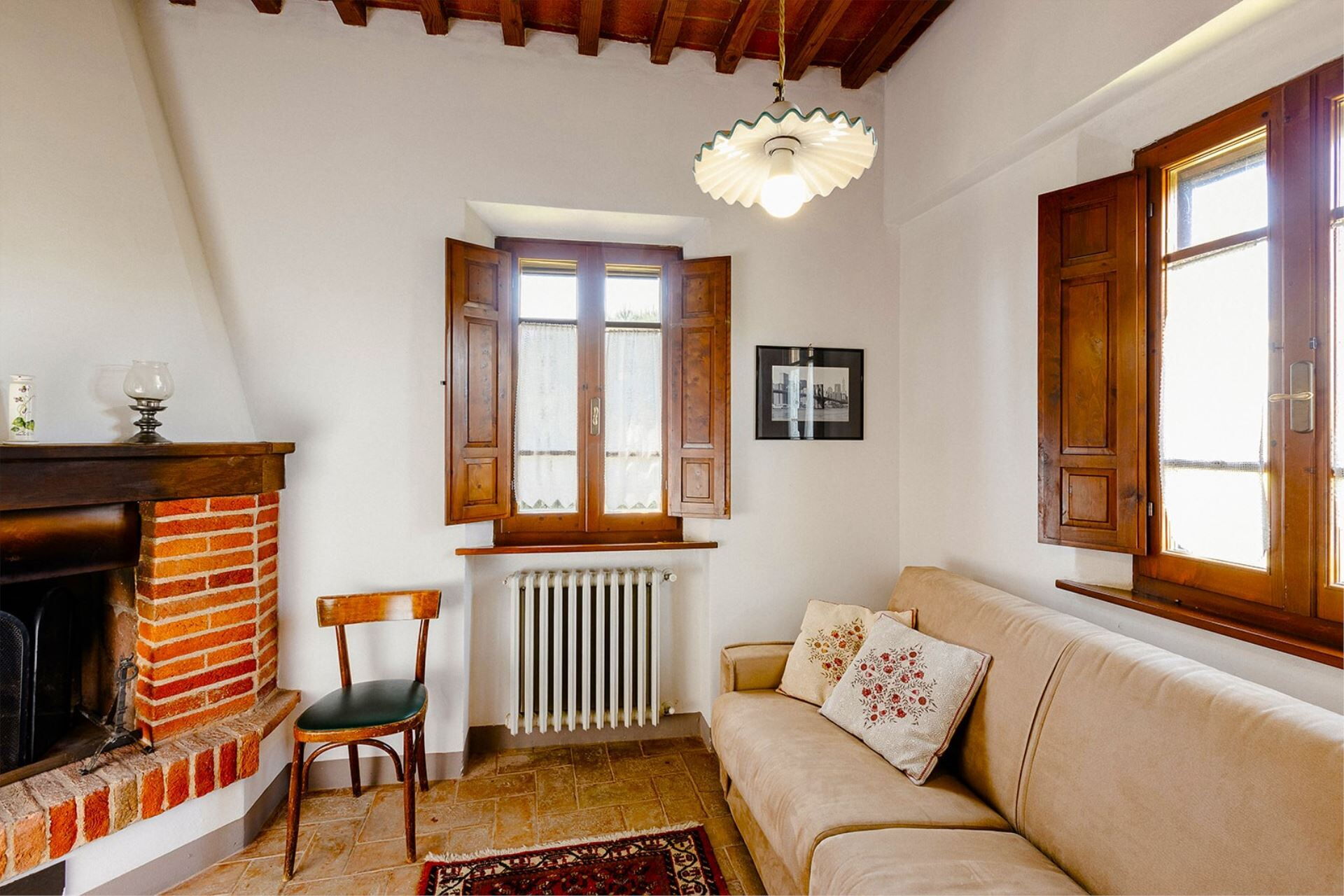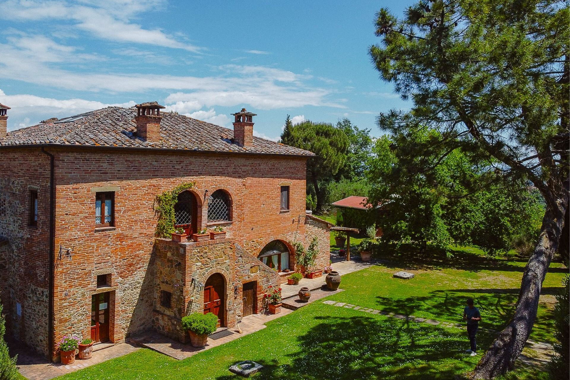 A spacious garden hugged by cypresses and other densely green trees, views of rolling hills and lush Tuscan landscapes all around, a private pool, a terracotta roof, a pretty and traditional Tuscan kitchen, charming bedrooms finished with detail and care, high exposed-beam ceilings, a nice little covered area for dining al fresco, lots of rooms with direct exits out onto the terrace... all of this and more is what you can expect from the gorgeous and wonderfully and typically Tuscan Villa La Fragola (meaning Strawberry Villa) just 500m outside the village of Chianacce, 19km (12 miles) from Montepulciano. Positioned in an especially scenic and peaceful part of the world that is ideal for those looking to get away from it all and relax on their vacation, this gem allows you to get a real taste of the charming and slow-paced life of rural Tuscany while also being ideally located just 5km from the highway and allowing easy access to many of the region’s most famous destinations and attractions. Those who choose Villa La Fragola, therefore, will get the best of both worlds – the restful escape into the dreamy Tuscan countryside and plenty of opportunities to play the serious tourist and tick some key sights off of your bucket list. In addition to Montepulciano being just 19km (12 miles) away, other nearby cities include Cortona 20km (12 miles) away, Arezzo 45km (28 miles) away, Montalcino 52km (32 miles) away, and Perugia 62km (39 miles) away.