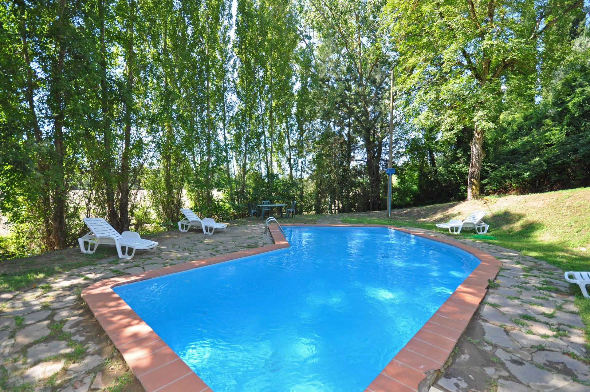 At guests’ disposal: garden, irregular shaped, shared swimming-pool (10 x 5 m – min. depth 1,5 m – max. depth 3 m). A tennis court is 4 km from the property away and is available free of charge.