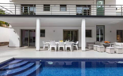 You will be staying in a spacious and bright 6-room villa that spans over 520 square meters. The modern and comfortable furnishings include a living/dining room equipped with an open-hearth fireplace (for decorative purposes only), satellite TV, digital TV, air conditioning, and electric shutters. The living/dining area opens up to the patio and swimming pool area. There are two double bedrooms, each featuring a French bed (160 cm wide and 190 cm long), with access to the patio and swimming pool. The villa boasts a large, open kitchen with an oven, dishwasher, four ceramic glass hob hotplates, toaster, kettle, microwave, freezer, electric coffee machine, and a cooking island with a dining table. Additionally, there is a bathroom with a bath, bidet, and WC, as well as a separate WC. The villa is equipped with electric heating and air conditioning. The upper floor consists of one room with a French bed (160 cm wide and 190 cm long) that opens to a terrace, and one double bedroom with a French bed (190 cm wide and 200 cm long), also with access to the terrace. There is another bathroom on this floor with a shower, bidet, and WC.