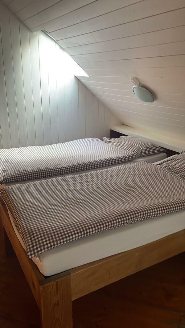 "Typ 10 MEDIUM", 6-room bungalow on 2 levels. Partly with sloping ceilings, very simple and practical furnishings: open living/dining room with dining table. Exit to the balcony. 4 open rooms with sloping ceilings, each room with 1 bed (90 cm, length 200 cm). Small, open kitchen (3 hot plates, oven, toaster, kettle, microwave, electric coffee machine, Capsules for coffee machine (Delizio) extra). Shower/WC, sep. WC. Boiler. Upper floor: gallery with 2 beds (90 cm, length 200 cm). 2 open rooms with sloping ceilings, each room with 2 beds (90 cm, length 200 cm). Balcony. Box-room. Please note: suitable for families. Non-smoking house. 1 pet/ dog allowed. LEAR 4109